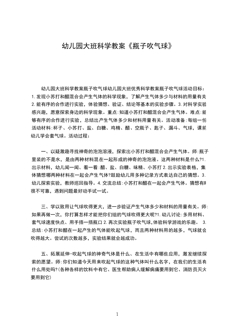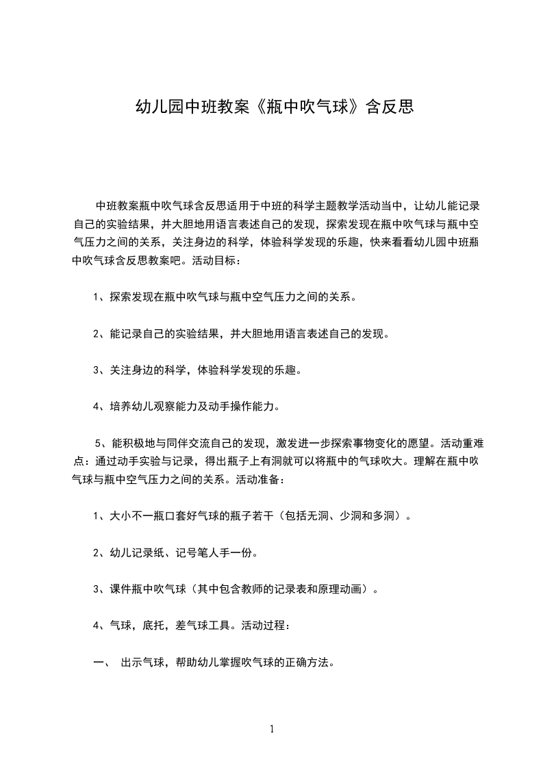五、 活动延伸。师:今天我们小朋友通过做实验发现了瓶上有洞洞可以将瓶中的气球吹得大大的。那还有没有其它的办法也可以可以将瓶中的气球吹大呢?回家后和爸爸妈妈想一想,也去试一试,如果成功了也可以把你们成功的秘密告诉大家哦!(分析:最后教师抛出的问题:还有没有其它的办法也可以可以将瓶中的气球吹大呢?通过这个问题与活动延伸自然衔接,让此次活动有了很好的扩展。同时又提供了一次亲子之间、家园共育的机会。)活动反思:本活动旨在让幼儿在看看、说说、试试、比比的过程中发现瓶上有洞瓶中的气球就能被吹大,在探索发现中了解瓶中吹气球与瓶中空气压力之间的关系,从而能更加关注起身边的科学,激发幼儿学习科学的兴趣以及学习如何去探究科学奥秘。这次的活动从“吹气球”到“瓶中吹气球”,难度逐渐加深,激发了幼儿在瓶中吹气球的兴趣,积极投入到探索活动中。通过一次又一次的试验、猜想与排除,最终建构了认识:在小瓶子里吹不大气球;能不能在瓶中吹大气球与瓶子的大小没有关系,瓶上有洞洞的气球才能被吹大,解决本次活动的重难点。揭示出来的奥秘不该就这样被搁置停留在原地,所以又增加了瓶中吹气球比赛这一环节,使得每个幼儿都有机会去体验成功,并在此基础上又一次提升了科学认知。在这次的探索活动中教师虽放手但不忘指导,在幼儿遇到瓶颈之处,帮助幼儿纵向探究从而使幼儿的认识得到升华。活动过程中,幼儿在探究之时,由于瓶中吹气球的有趣现象,很容易就转移了幼儿的注意力,所以个别定力不足的幼儿需要教师不断的提醒他完成任务。小百科:气球是充满空气或某种别的气体的一种密封袋。气球不但可作为玩具,也可作为运输工具。