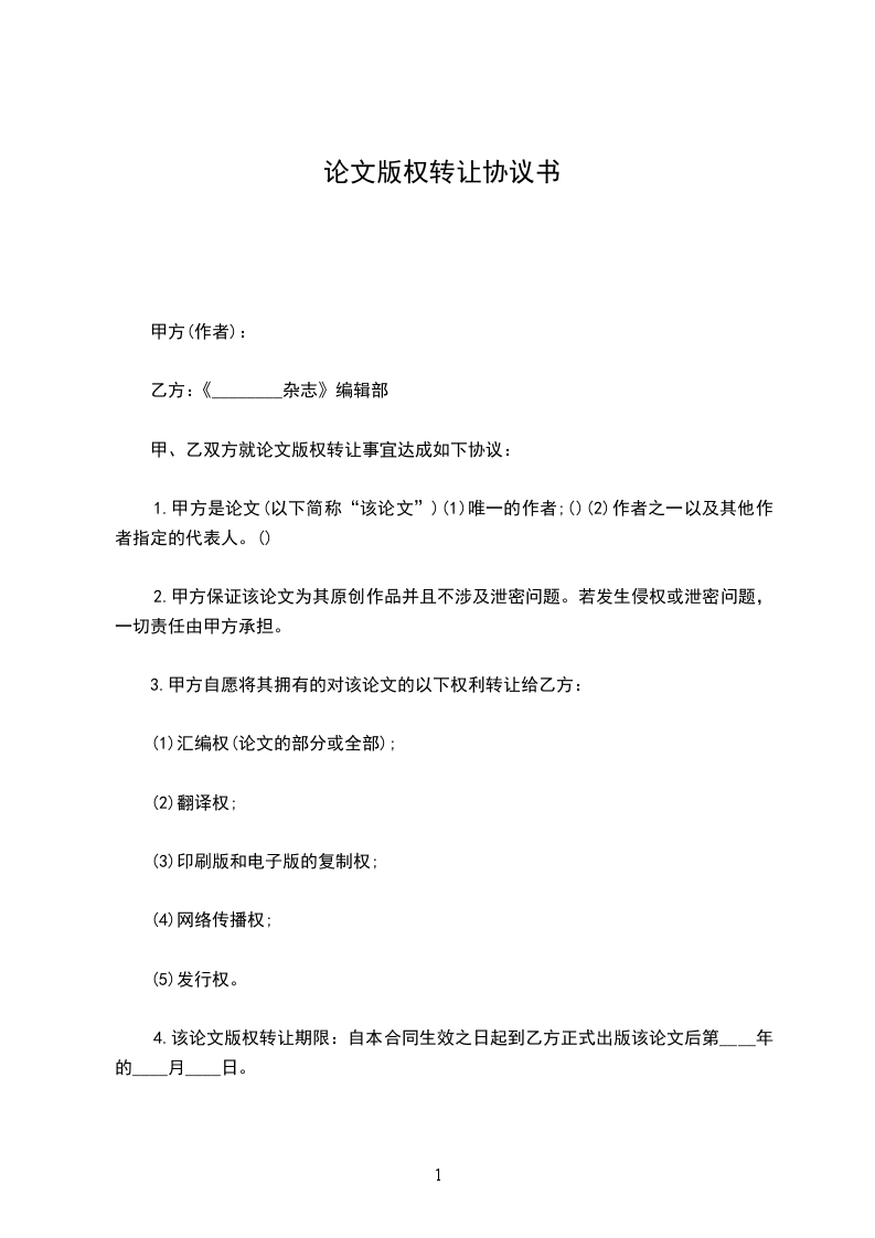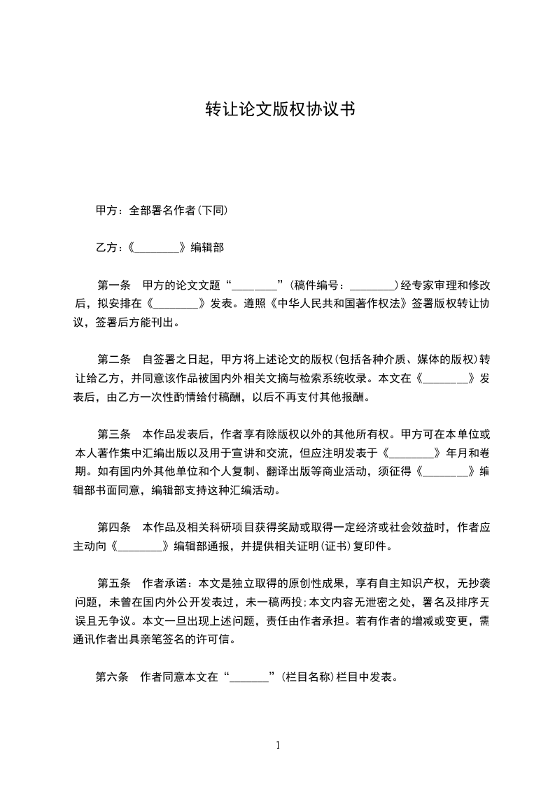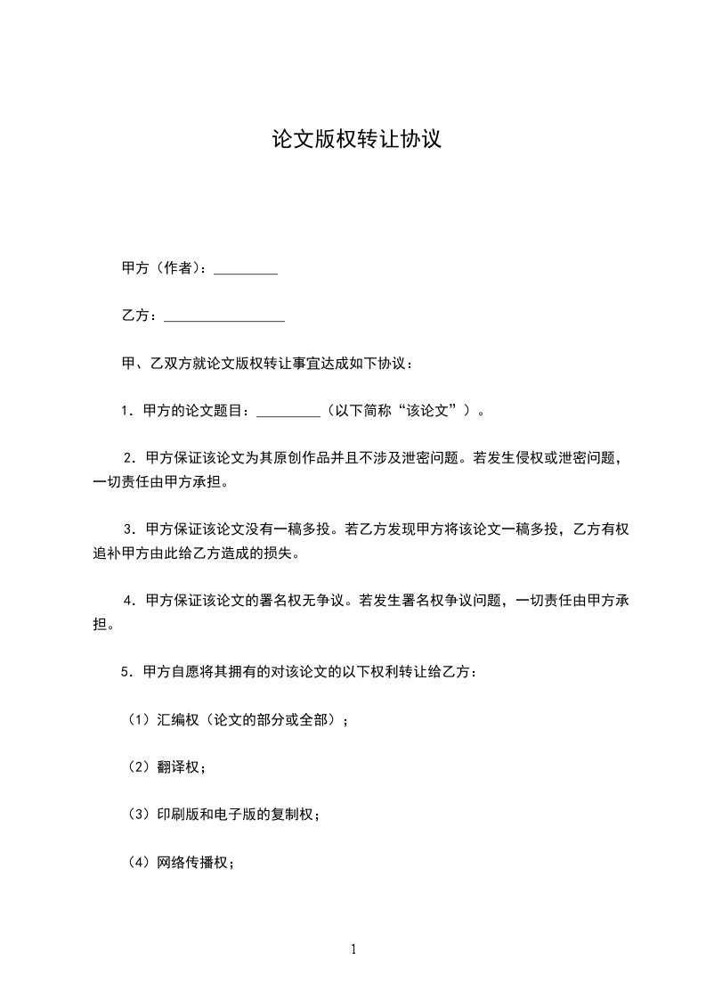 甲、乙双方就论文版权转让事宜达成如下协议: