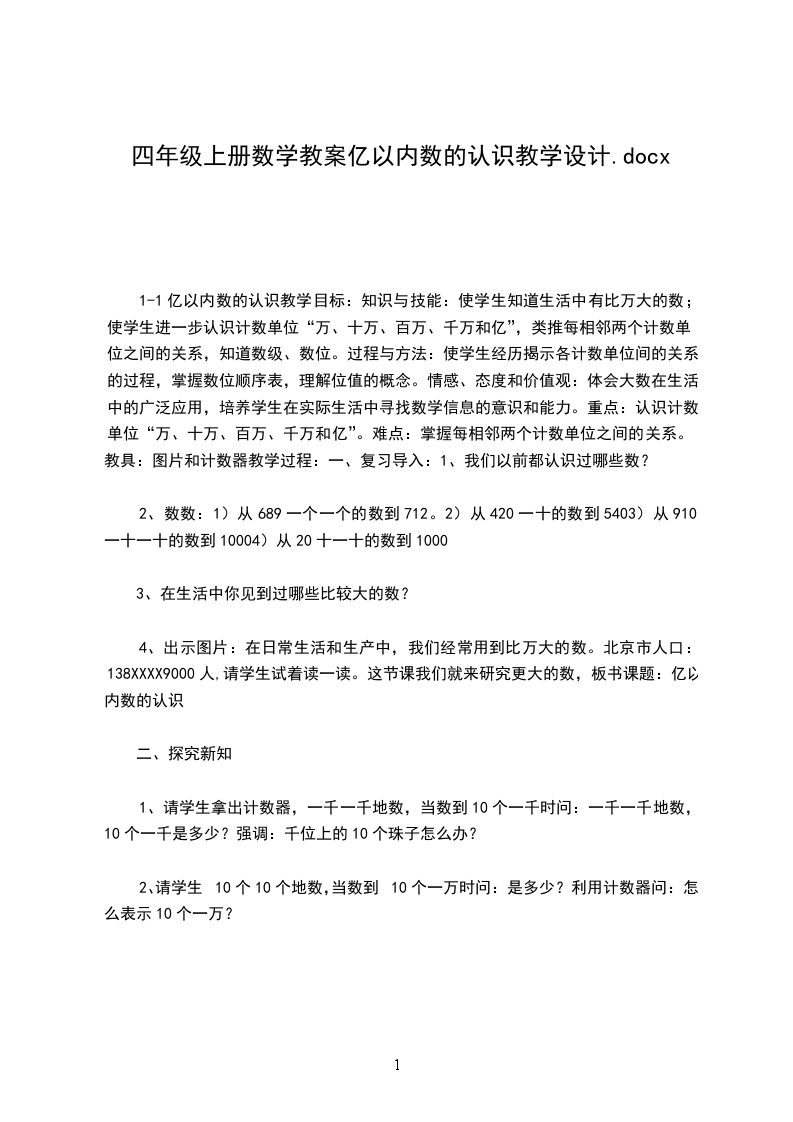 小学四年级下册数学亿以上数的认识教学设计亿以上数的认识教学目标: