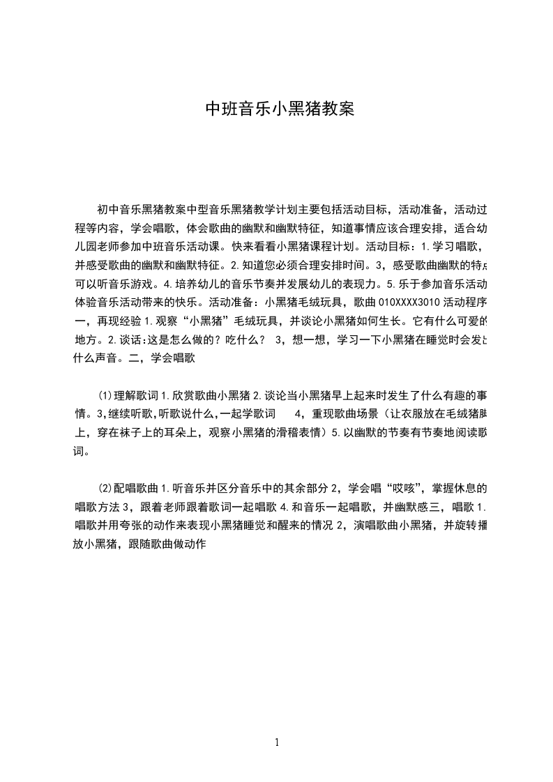 (2)配唱歌曲1.听音乐并区分音乐中的其余部分2,学会唱“哎咳”,掌握休息的唱歌方法3,跟着老师跟着歌词一起唱歌4.和音乐一起唱歌,并幽默感三,唱歌1.唱歌并用夸张的动作来表现小黑猪睡觉和醒来的情况2,演唱歌曲小黑猪,并旋转播放小黑猪,跟随歌曲做动作