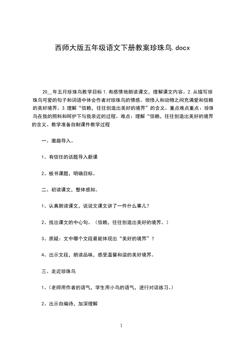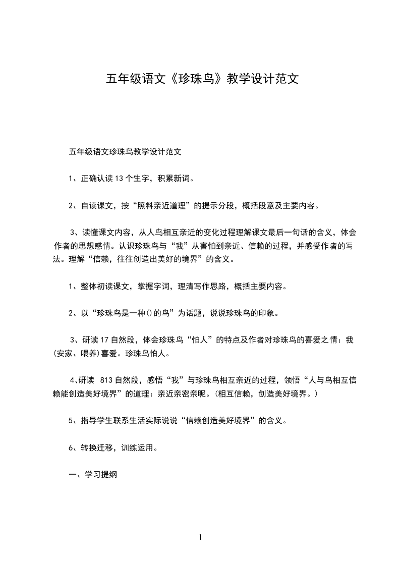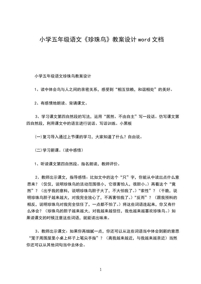 五年级语文珍珠鸟教学设计范文