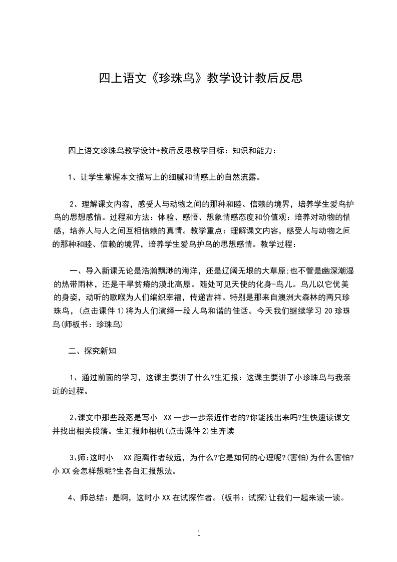 3、读懂课文内容,从人鸟相互亲近的变化过程理解课文最后一句话的含义,体会作者的思想感情。认识珍珠鸟与“我”从害怕到亲近、信赖的过程,并感受作者的写法。理解“信赖,往往创造出美好的境界”的含义。