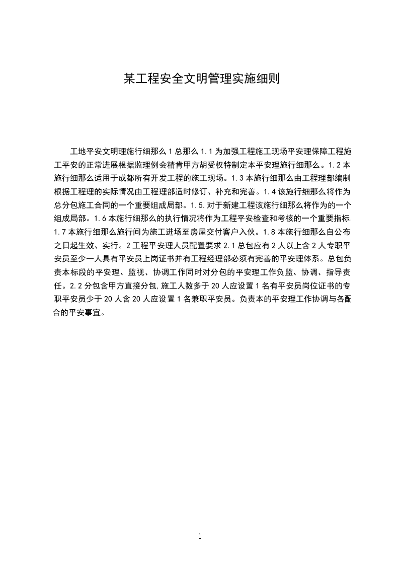 工地平安文明理施行细那么1总那么1.1为加强工程施工现场平安理保障工程施工平安的正常进展根据监理例会精肯甲方胡受权特制定本平安理施行细那么。1.2本施行细那么适用于成都所有开发工程的施工现场。1.3本施行细那么由工程理部编制根据工程理的实际情况由工程理部适时修订、补充和完善。1.4该施行细那么将作为总分包施工合同的一个重要组成局部。1.5.对于新建工程该施行细那么将作为的一个组成局部。1.6本施行细那么的执行情况将作为工程平安检查和考核的一个重要指标。1.7本施行细那么施行间为施工进场至房屋交付客户入伙。1.8本施行细那么自公布之日起生效、实行。2工程平安理人员配置要求2.1总包应有2人以上含2人专职平安员至少一人具有平安员上岗证书并有工程经理部必须有完善的平安理体系。总包负责本标段的平安理、监视、协调工作同时对分包的平安理工作负监、协调、指导责任。2.2分包含甲方直接分包,施工人数多于20人应设置1名有平安员岗位证书的专职平安员少于20人含20人应设置1名兼职平安员。负责本的平安理工作协调与各配合的平安事宜。