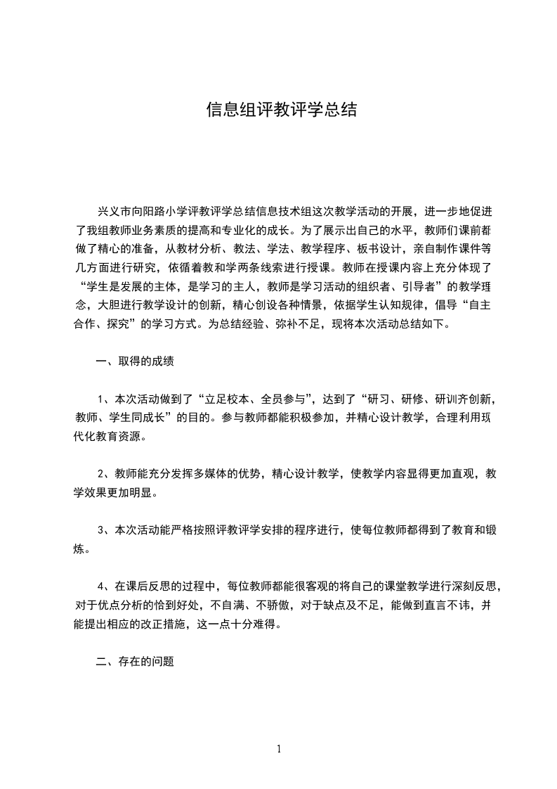 兴义市向阳路小学评教评学总结信息技术组这次教学活动的开展,进一步地促进了我组教师业务素质的提高和专业化的成长。为了展示出自己的水平,教师们课前都做了精心的准备,从教材分析、教法、学法、教学程序、板书设计,亲自制作课件等几方面进行研究,依循着教和学两条线索进行授课。教师在授课内容上充分体现了“学生是发展的主体,是学习的主人,教师是学习活动的组织者、引导者”的教学理念,大胆进行教学设计的创新,精心创设各种情景,依据学生认知规律,倡导“自主、合作、探究”的学习方式。为总结经验、弥补不足,现将本次活动总结如下。
