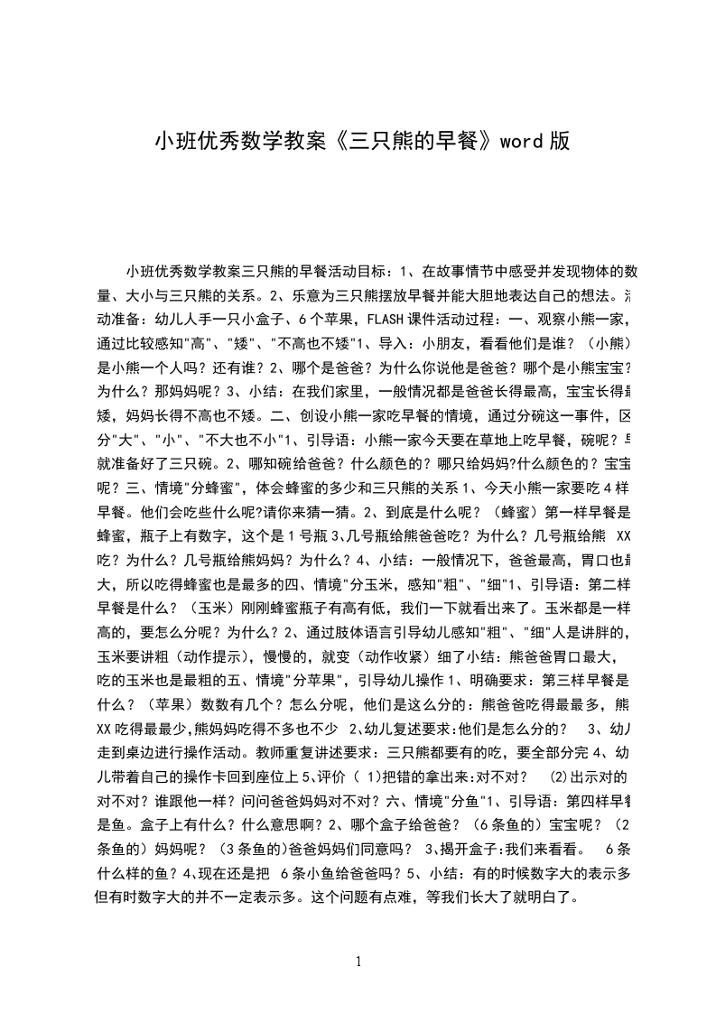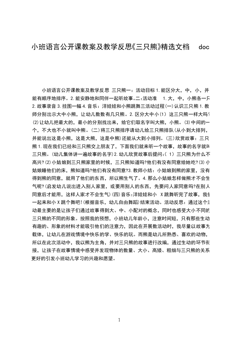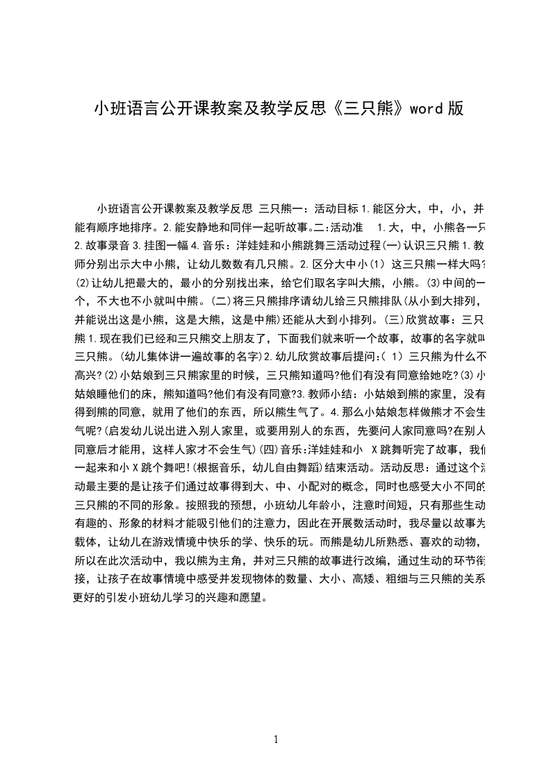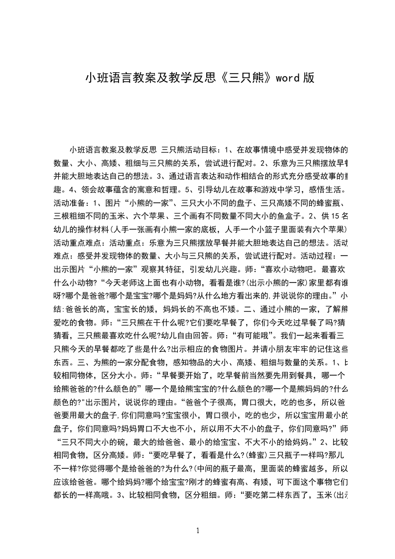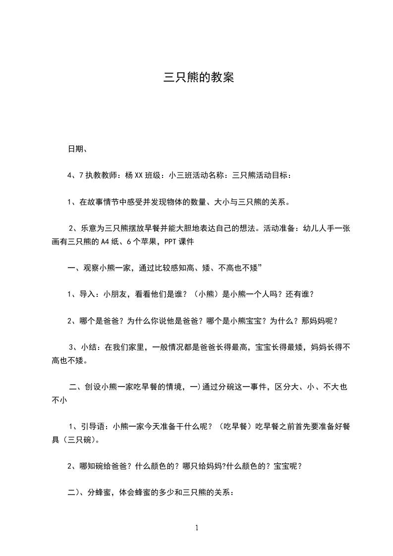 一、 引发兴趣1.出示三只熊的图片,介绍熊的一家。2.出示三只碗的的图片提问:你猜猜看这三只碗是谁用的?3.出示三把椅子的图片,请幼儿说说这三把椅子分别是谁坐。