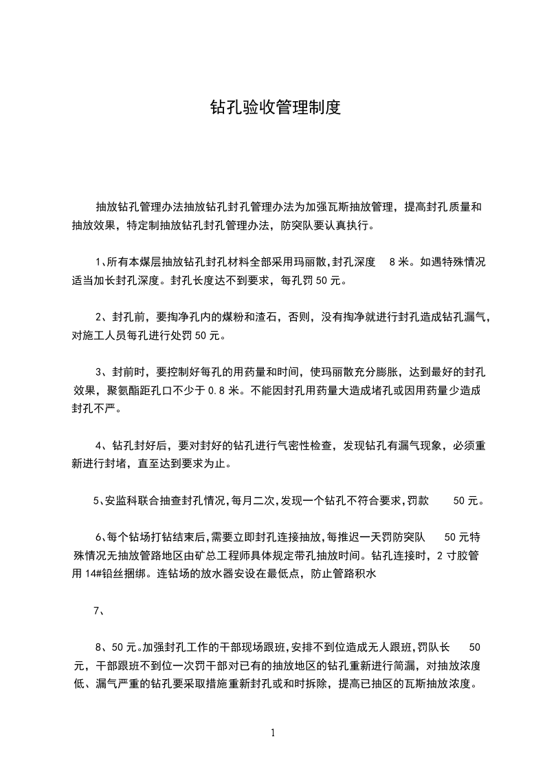 1、所有本煤层抽放钻孔封孔材料全部采用玛丽散,封孔深度8米。如遇特殊情况适当加长封孔深度。封孔长度达不到要求,每孔罚50元。
