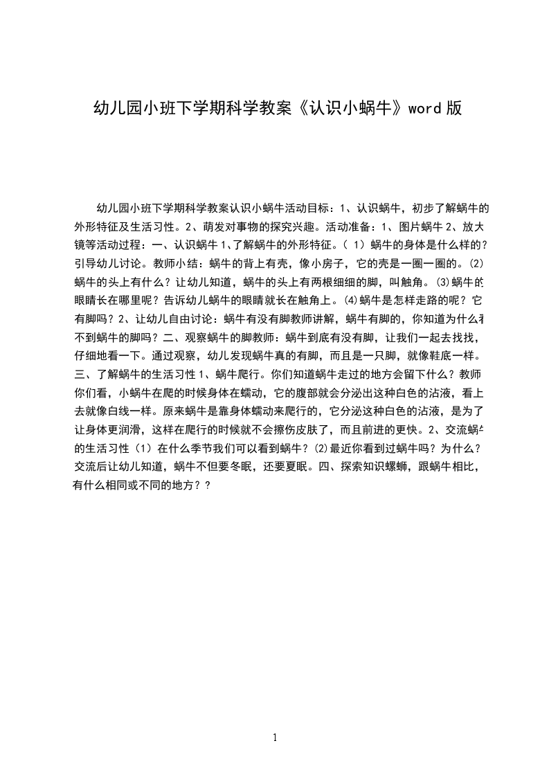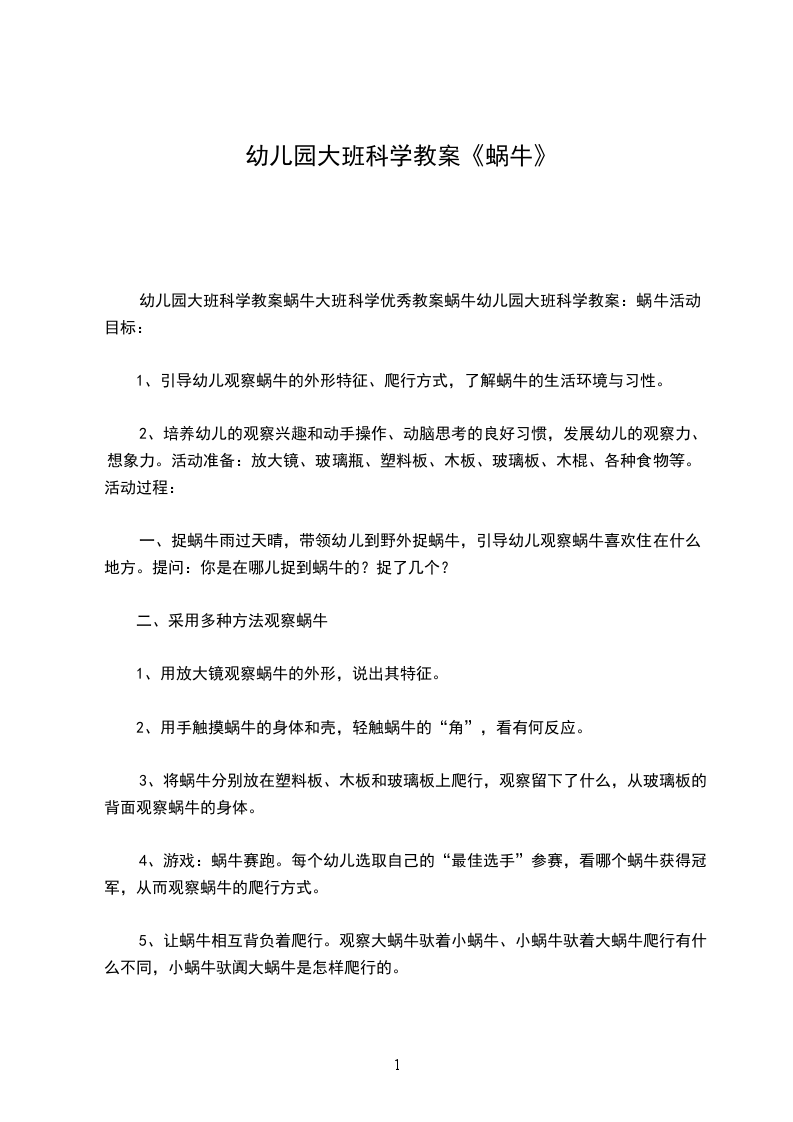 幼儿园大班科学教案蜗牛大班科学优秀教案蜗牛幼儿园大班科学教案:蜗牛活动目标: