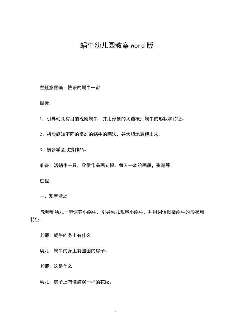1、引导幼儿观察蜗牛的外形特征、爬行方式,了解蜗牛的生活环境与习性。