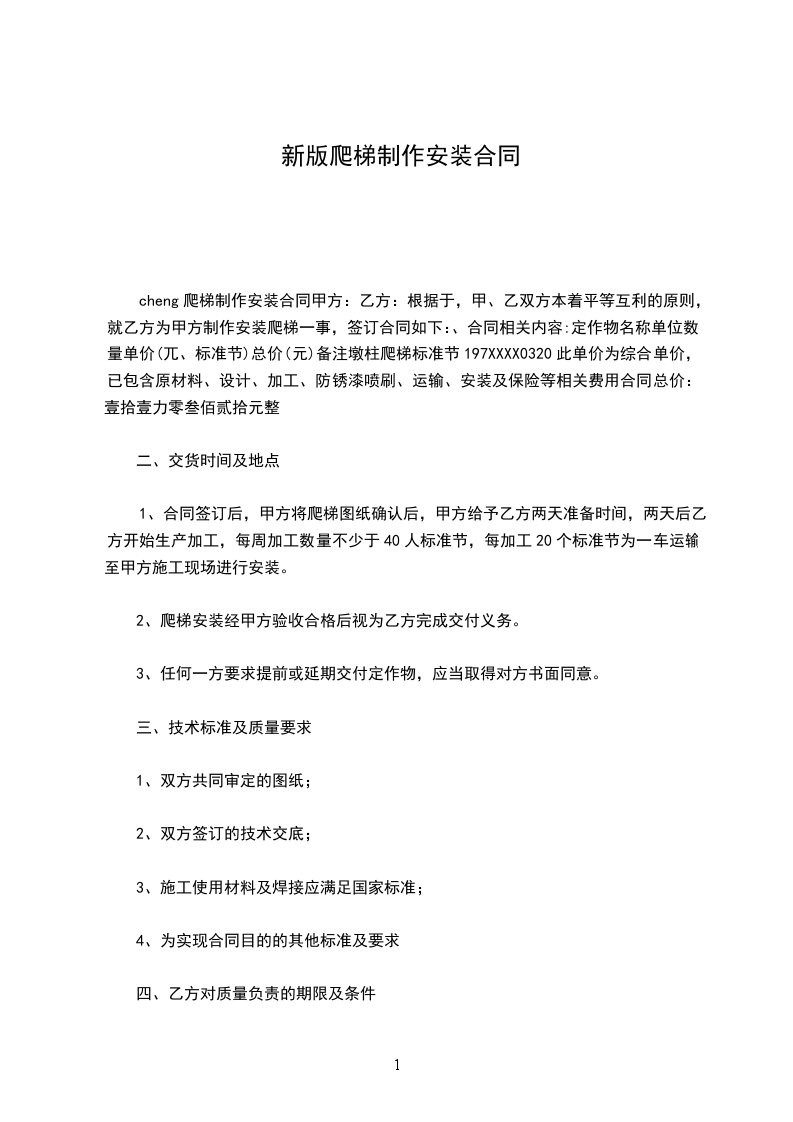 cheng爬梯制作安装合同甲方:乙方:根据于,甲、乙双方本着平等互利的原则,就乙方为甲方制作安装爬梯一事,签订合同如下:、合同相关内容:定作物名称单位数量单价(兀、标准节)总价(元)备注墩柱爬梯标准节197XXXX0320此单价为综合单价,已包含原材料、设计、加工、防锈漆喷刷、运输、安装及保险等相关费用合同总价:壹拾壹力零叁佰贰拾元整