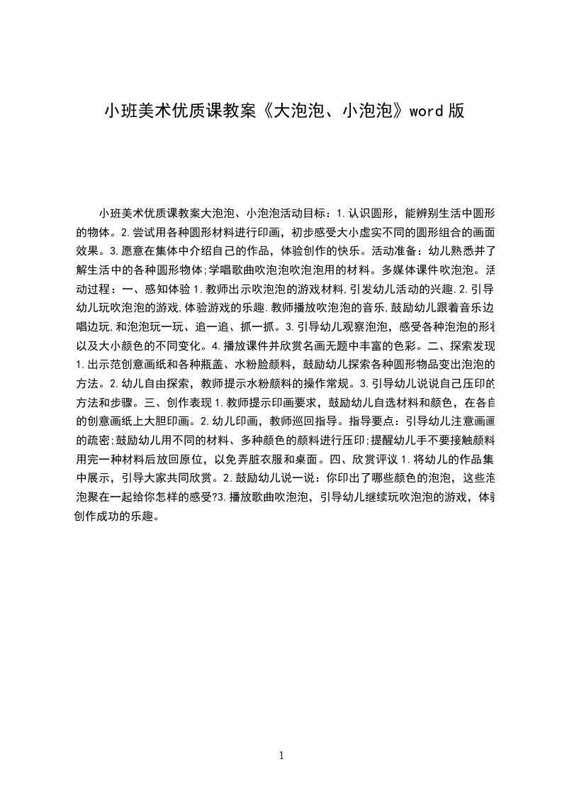 幼儿吹泡泡作画,教师融入幼儿一起吹泡泡,在吹的过程中引导幼儿主动发现:将吸管一头蘸上颜色水,在盆子边上靠一下。对着纸,轻轻地吹出一个泡泡,纸上就留下了一个彩色的泡泡。不要总用一种颜色吹,换颜色时要把吸管清洗一下。移动纸时要双手端平。活动结束:教师表扬专心吹泡泡的幼儿,提醒幼儿注意卫生,带领幼儿去洗手。
