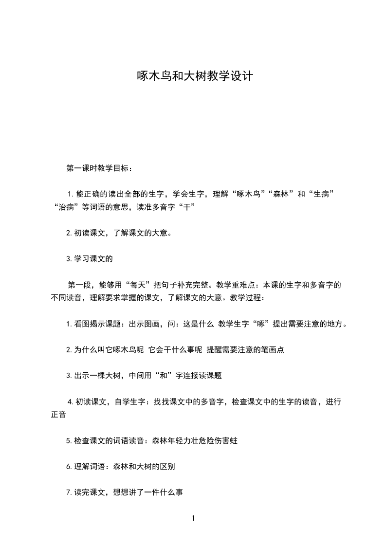 1.能正确的读出全部的生字,学会生字,理解“啄木鸟”“森林”和“生病”“治病”等词语的意思,读准多音字“干”