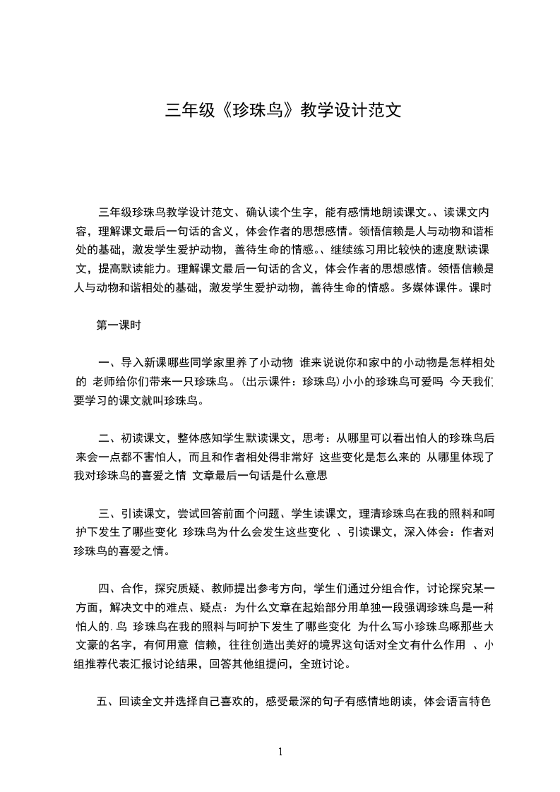 三年级珍珠鸟教学设计范文、确认读个生字,能有感情地朗读课文。、读课文内容,理解课文最后一句话的含义,体会作者的思想感情。领悟信赖是人与动物和谐相处的基础,激发学生爱护动物,善待生命的情感。、继续练习用比较快的速度默读课文,提高默读能力。理解课文最后一句话的含义,体会作者的思想感情。领悟信赖是人与动物和谐相处的基础,激发学生爱护动物,善待生命的情感。多媒体课件。课时。