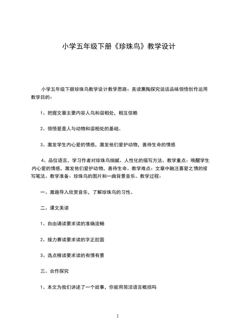 一、导入新课哪些同学家里养了小动物 谁来说说你和家中的小动物是怎样相处的 老师给你们带来一只珍珠鸟。(出示课件:珍珠鸟)小小的珍珠鸟可爱吗 今天我们要学习的课文就叫珍珠鸟。