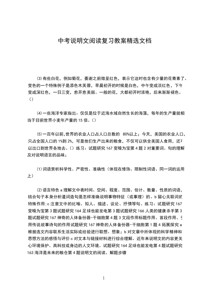四、说明文语言的特点典型考题A、加点字词有何作用?用了“”词,生动地(准确地)说明了事物的特征,符合实际情况,具有科学性。B、能否替换为另一个词语?为什么?答题格式:表态不能够原词的内容或意思所换词语的内容或意思换了以后的变化,不符合实际总结,所以不能换。C、加点词语能否删去?为什么?答题格式:表态不能,说明理由,删掉“”词,句子的意思就变成了,显得太绝对化;用了“”词,准确地说明了,符合实际情况,留有余地,具有科学性,所以不能删去。这类词语往往是表程度的如最、非常、十分等,表估计的如大约、可能、左右等。方法:说明文语言的特点一般从二个角度谈:A、准确;B、形象生动或简明平实。