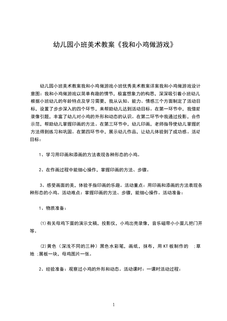 幼儿园小班美术教案我和小鸡做游戏小班优秀美术教案详案我和小鸡做游戏设计意图:我和小鸡做游戏以简单有趣的情节,极富想象力的构思,深深吸引着小班幼儿。根据小班幼儿的年龄特点及学习需要,我从认知、能力、情感三个方面制定了活动目标,设置了步步深入的四个环节,来帮助幼儿达到活动目标。在第一环节中,我借助录像引题,丰富了幼儿对小鸡的外形和动态的认识。在第二环节中我通过投影,合作示范,帮助幼儿掌握印画的方法。在第三环节中,幼儿印画,老师指导使幼儿掌握的方法得到练习和巩固。在第四环节中,展示幼儿作品,让幼儿体验到了成功感。活动目标: