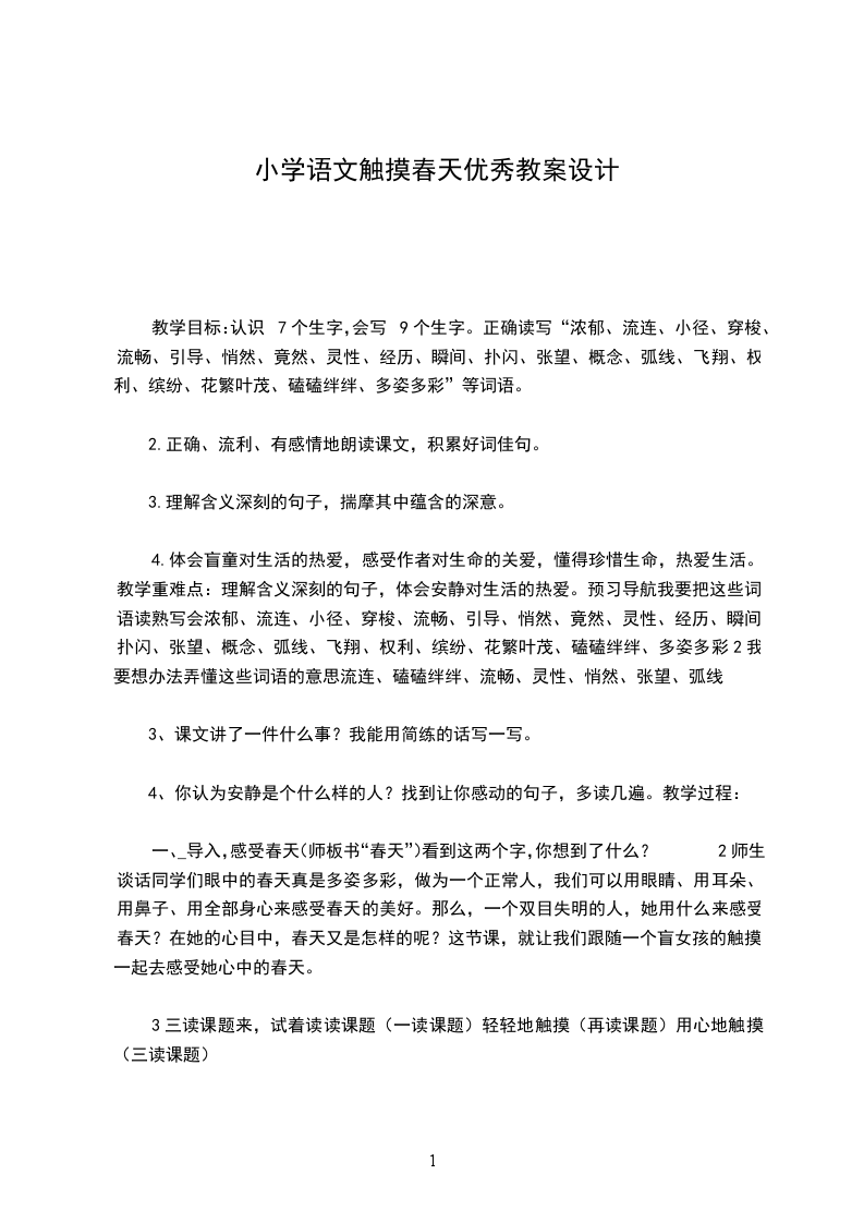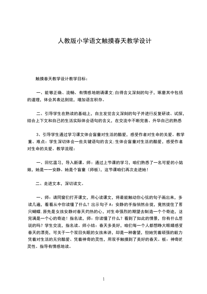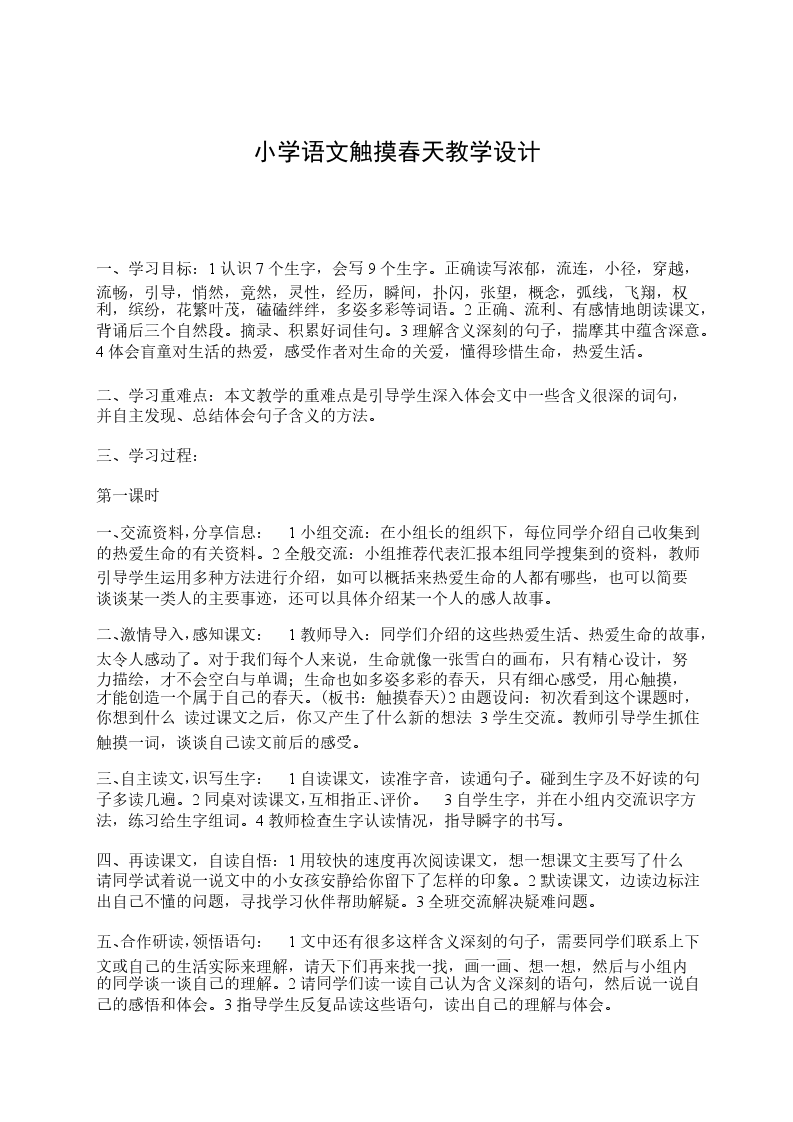 二、激情导入,感知课文:1教师导入:同学们介绍的这些热爱生活、热爱生命的故事,太令人感动了。对于我们每个人来说,生命就像一张雪白的画布,只有精心设计,努力描绘,才不会空白与单调;生命也如多姿多彩的春天,只有细心感受,用心触摸,才能创造一个属于自己的春天。(板书:触摸春天)2由题设问:初次看到这个课题时,你想到什么 读过课文之后,你又产生了什么新的想法 3学生交流。教师引导学生抓住触摸一词,谈谈自己读文前后的感受。