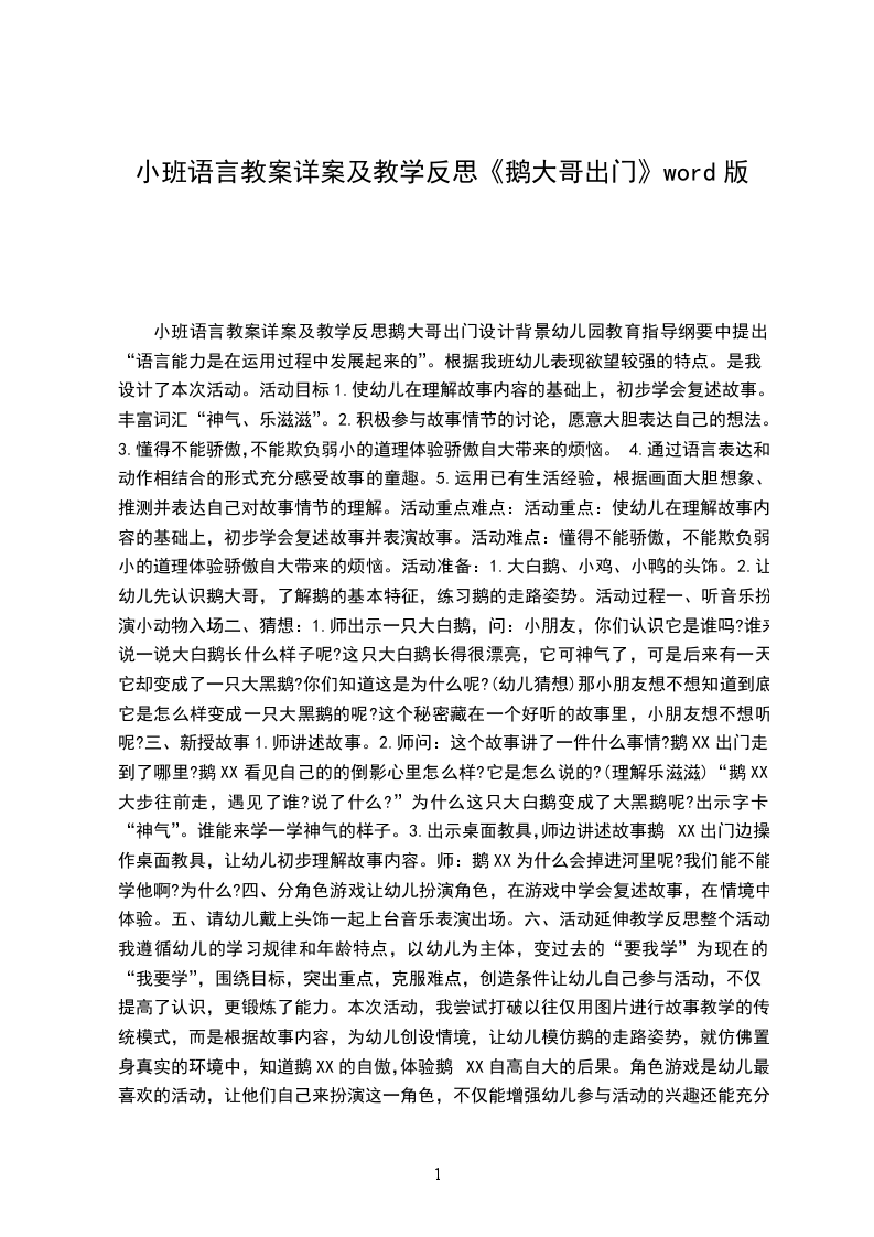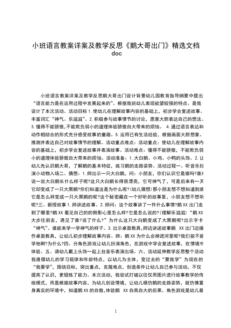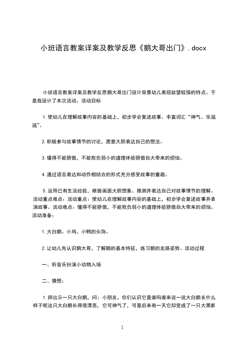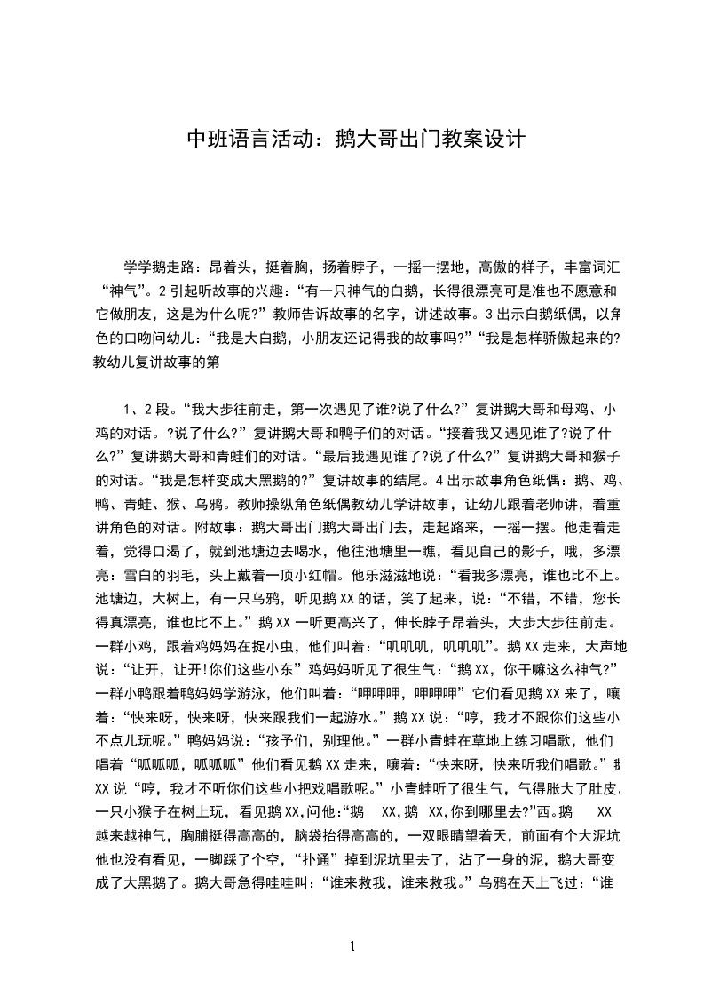 1、2段。“我大步往前走,第一次遇见了谁?说了什么?”复讲鹅大哥和母鸡、小鸡的对话。?说了什么?”复讲鹅大哥和鸭子们的对话。“接着我又遇见谁了?说了什么?”复讲鹅大哥和青蛙们的对话。“最后我遇见谁了?说了什么?”复讲鹅大哥和猴子的对话。“我是怎样变成大黑鹅的?”复讲故事的结尾。4出示故事角色纸偶:鹅、鸡、鸭、青蛙、猴、乌鸦。教师操纵角色纸偶教幼儿学讲故事,让幼儿跟着老师讲,着重讲角色的对话。附故事:鹅大哥出门鹅大哥出门去,走起路来,一摇一摆。他走着走着,觉得口渴了,就到池塘边去喝水,他往池塘里一瞧,看见自己的影子,哦,多漂亮:雪白的羽毛,头上戴着一顶小红帽。他乐滋滋地说:“看我多漂亮,谁也比不上。”池塘边,大树上,有一只乌鸦,听见鹅XX的话,笑了起来,说:“不错,不错,您长得真漂亮,谁也比不上。”鹅XX一听更高兴了,伸长脖子昂着头,大步大步往前走。一群小鸡,跟着鸡妈妈在捉小虫,他们叫着:“叽叽叽,叽叽叽”。鹅XX走来,大声地说:“让开,让开!你们这些小东”鸡妈妈听见了很生气:“鹅XX,你干嘛这么神气?”一群小鸭跟着鸭妈妈学游泳,他们叫着:“呷呷呷,呷呷呷”它们看见鹅XX来了,嚷着:“快来呀,快来呀,快来跟我们一起游水。”鹅XX说:“哼,我才不跟你们这些小不点儿玩呢。”鸭妈妈说:“孩予们,别理他。”一群小青蛙在草地上练习唱歌,他们唱着“呱呱呱,呱呱呱”他们看见鹅XX走来,嚷着:“快来呀,快来听我们唱歌。”鹅XX说“哼,我才不听你们这些小把戏唱歌呢。”小青蛙听了很生气,气得胀大了肚皮。一只小猴子在树上玩,看见鹅XX,问他:“鹅XX,鹅XX,你到哪里去?”西。鹅XX越来越神气,胸脯挺得高高的,脑袋抬得高高的,一双眼睛望着天,前面有个大泥坑,他也没有看见,一脚踩了个空,“扑通”掉到泥坑里去了,沾了一身的泥,鹅大哥变成了大黑鹅了。鹅大哥急得哇哇叫:“谁来救我,谁来救我。”乌鸦在天上飞过:“谁呀,谁掉到泥抗里了?”“是我,是我,是我大白鹅,请你快来救救我吧!”乌鸦说:“哦,原来,是漂亮的大白鹅呀。我没工夫来救你,你不是很神气吗?”说完就飞走了。