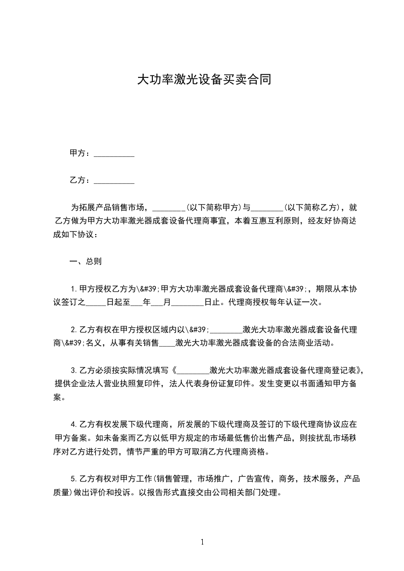1.甲方授权乙方为"甲方大功率激光器成套设备代理商",期限从本协议签订之日起至 年 月 日止. 代理商授权每年认证一次.