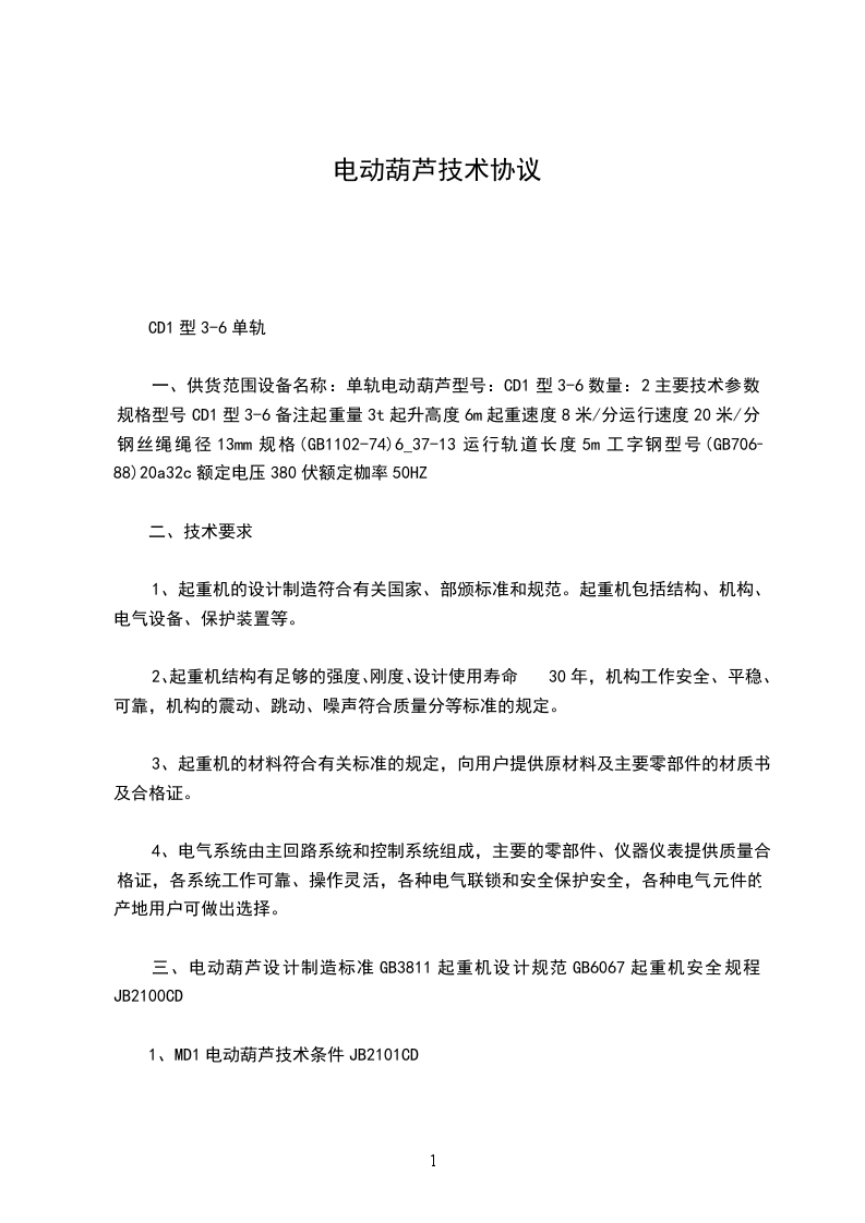 一、供货范围设备名称:单轨电动葫芦型号:CD1型3-6数量:2主要技术参数规格型号CD1型3-6备注起重量3t起升高度6m起重速度8米/分运行速度20米/分钢丝绳绳径13mm规格(GB1102-74)6_37-13运行轨道长度5m工字钢型号(GB706-88)20a32c额定电压380伏额定枷率50HZ