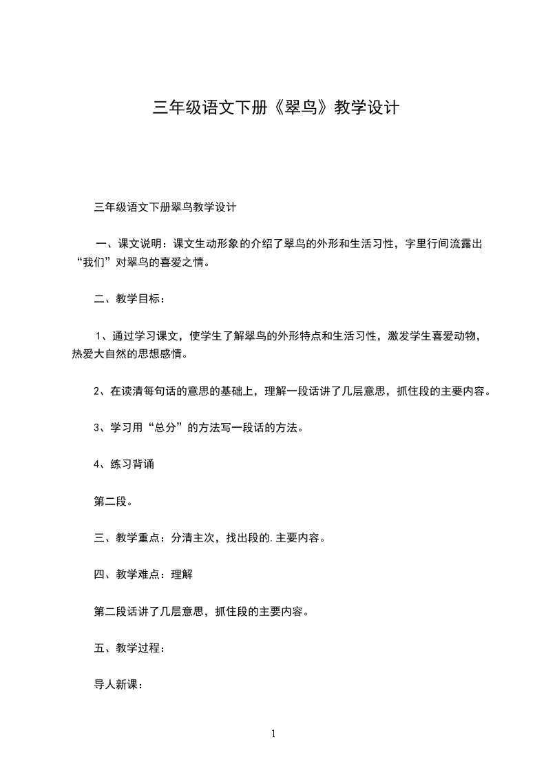 三年级语文下册翠鸟教学设计