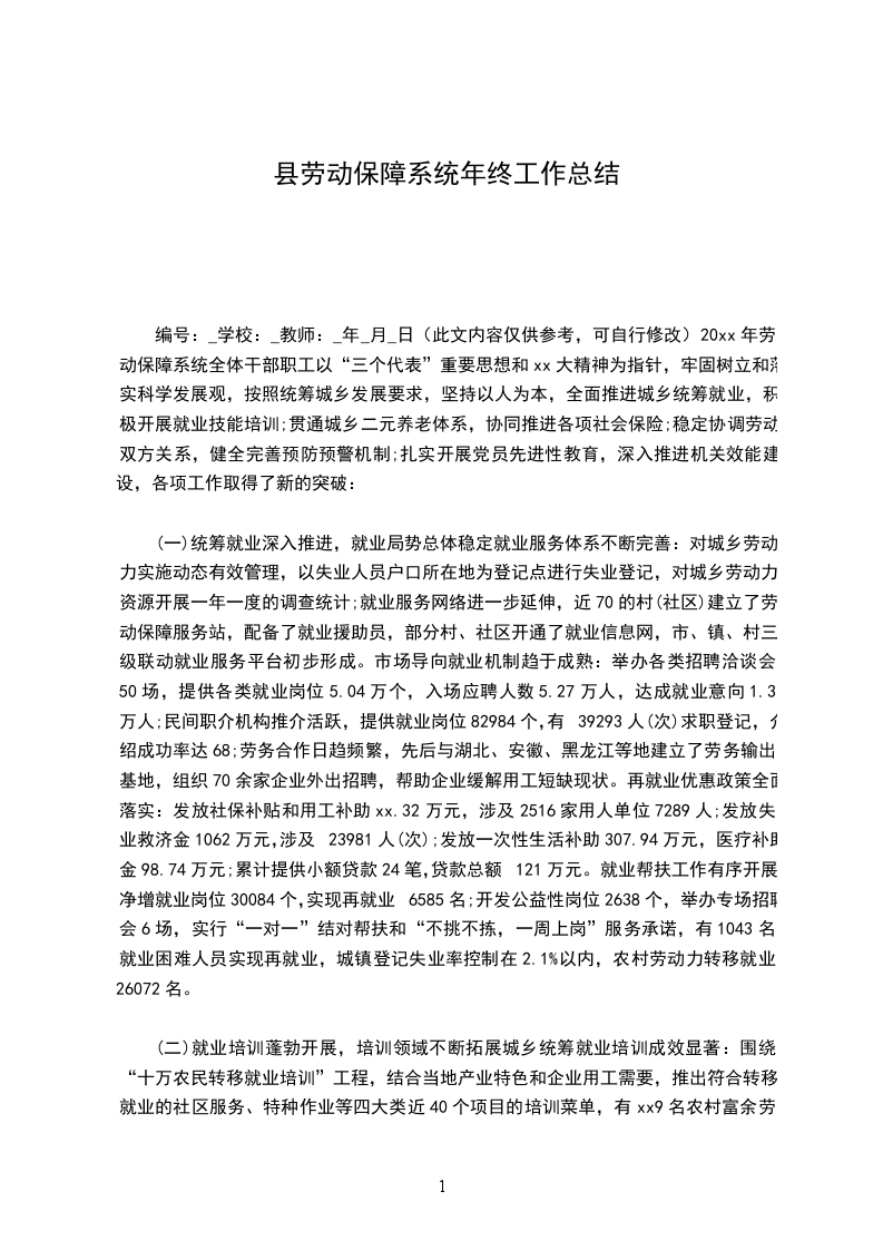 编号:_学校:_教师:_年_月_日(此文内容仅供参考,可自行修改)20xx年劳动保障系统全体干部职工以“三个代表”重要思想和xx大精神为指针,牢固树立和落实科学发展观,按照统筹城乡发展要求,坚持以人为本,全面推进城乡统筹就业,积极开展就业技能培训;贯通城乡二元养老体系,协同推进各项社会保险;稳定协调劳动双方关系,健全完善预防预警机制;扎实开展党员先进性教育,深入推进机关效能建设,各项工作取得了新的突破: