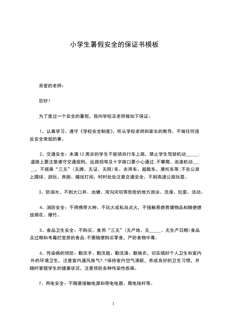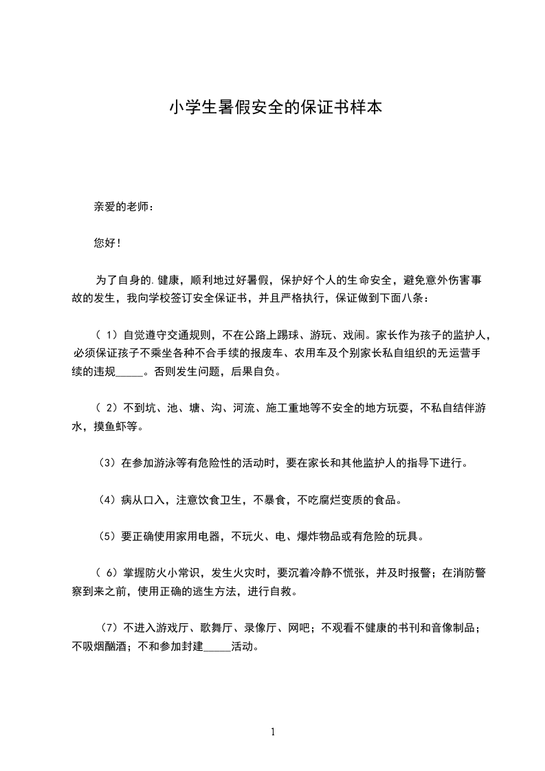 为了自身的健康,顺利地过好暑假,保护好个人的生命安全,避免意外伤害事故的发生,我向学校签订安全保证书,并且严格执行,保证做到下面八条: