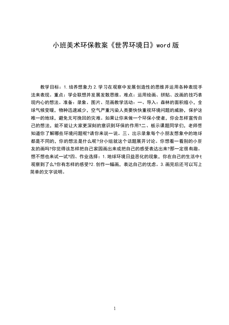 (1)小班美术环保教案世界环境日含反思教学目标:1.培养想象力2.学习在观察中发展创造性的思维并运用各种表现手法来表现。重点:学会联想并发展发散思维。难点:运用绘画、拼贴、改画的技巧表现内心的想法。准备:录象、图片、范画教学活动: