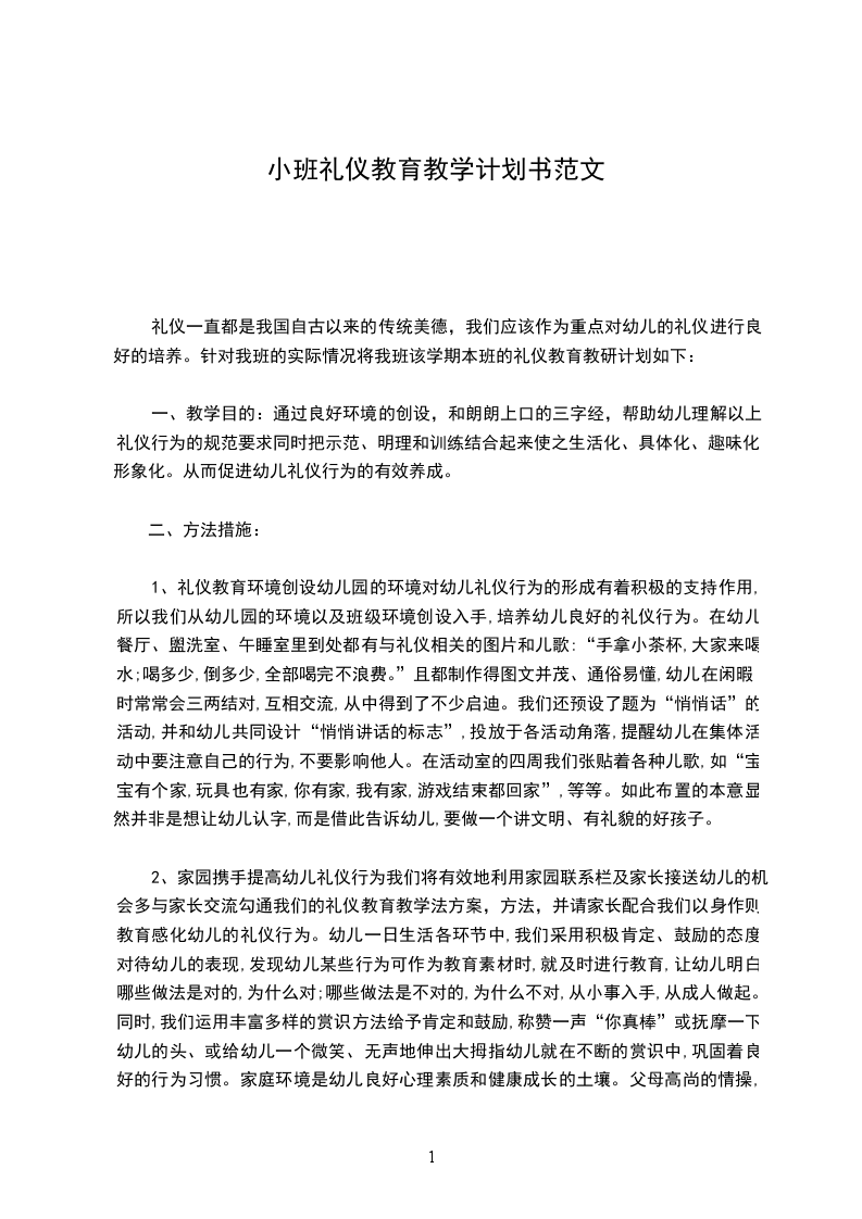 三、具体安排:三月份:(幼儿园礼仪)1,幼儿来园离园等一日活动中礼仪行为的培养。2.幼儿园礼仪教育:进餐礼仪、学会分享玩具、分享食物。四月份:(基本礼仪)