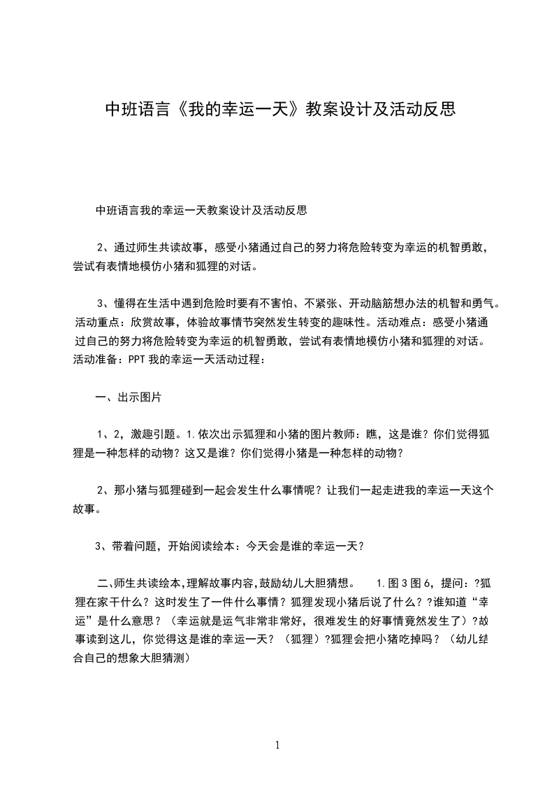 3、懂得在生活中遇到危险时要有不害怕、不紧张、开动脑筋想办法的机智和勇气。活动重点:欣赏故事,体验故事情节突然发生转变的趣味性。活动难点:感受小猪通过自己的努力将危险转变为幸运的机智勇敢,尝试有表情地模仿小猪和狐狸的对话。活动准备:PPT我的幸运一天活动过程:
