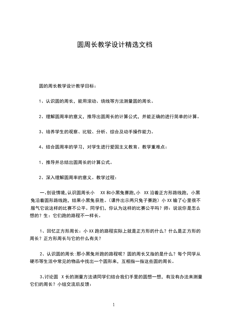 圆的周长教学设计教材简析圆的周长公式,对于学生来说是比较抽象的,所以,教材设计了两个实践活动,让学生通过小组合作、探究、交流,形象的感知到圆的周长与直径的关系,理解圆周率的意义及圆周长的计算方法。并让学生在研究过程中体验数学问题的探索性,体会数学与现实生活的密切联系。教学目标