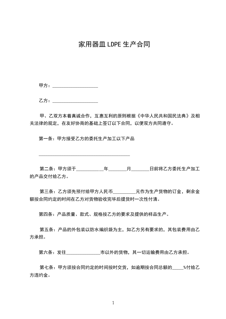 第一条:甲方接受乙方的委托生产加工以下产品