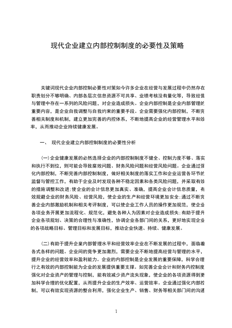 关键词现代企业内部控制必要性对策如今许多企业在经营与发展过程中仍然存在职责划分不够明确、内部各层次信息资源不可共享、业绩考核没有量化等,导致经营与管理中存在一系列的风险问题,对企业造成损失。企业内部控制是企业内部管理的重要内容,是企业自我调整与自我约束的重要手段。企业需要强化内部控制,不断完善相关制度和机制,建立更加完善的内控体系,不断地提高企业的经营管理水平和效率,从而推动企业持续健康发展。
