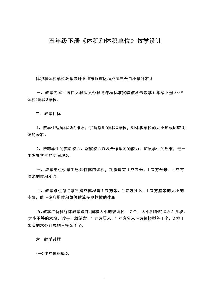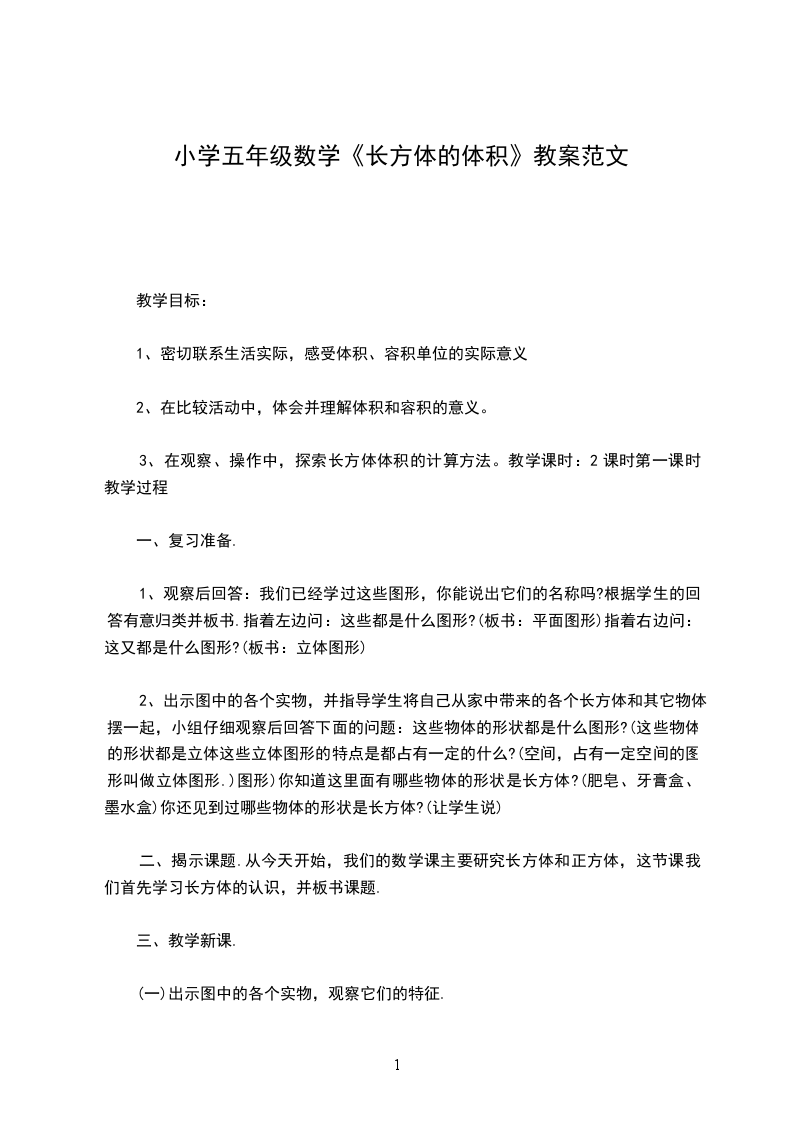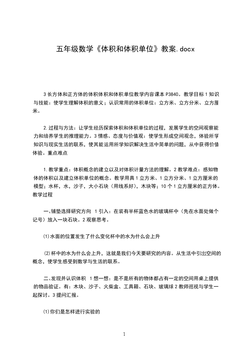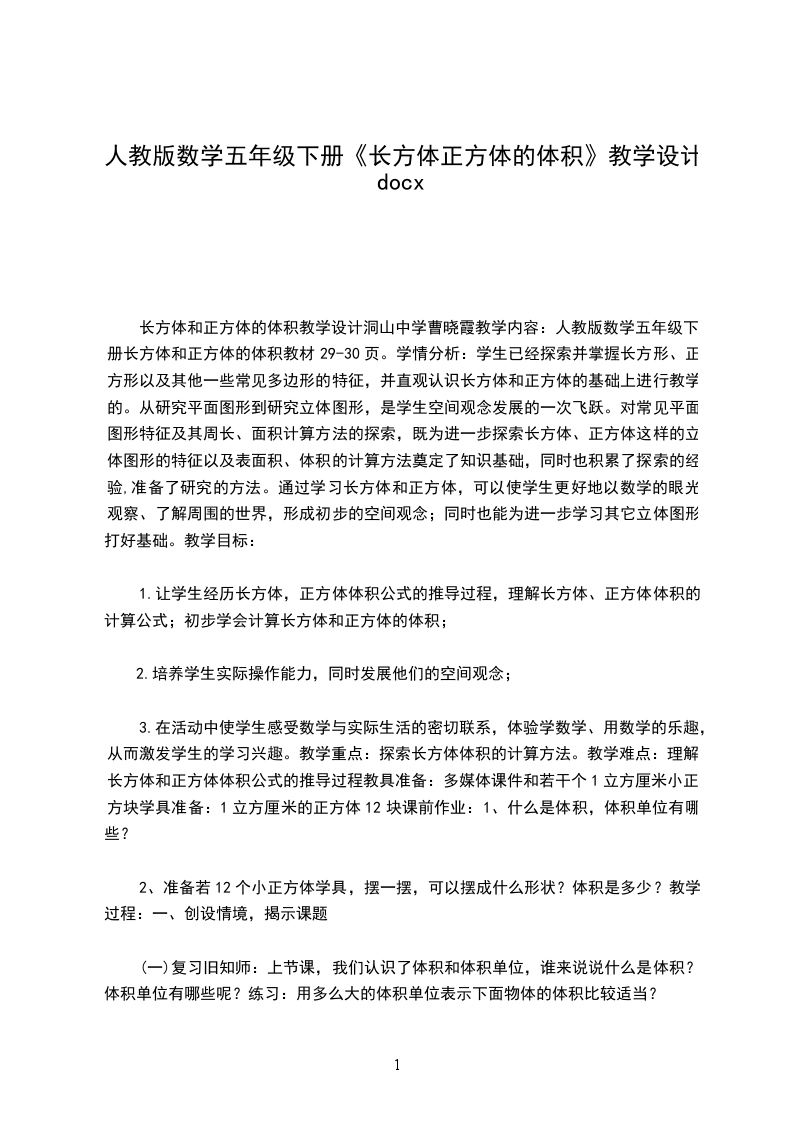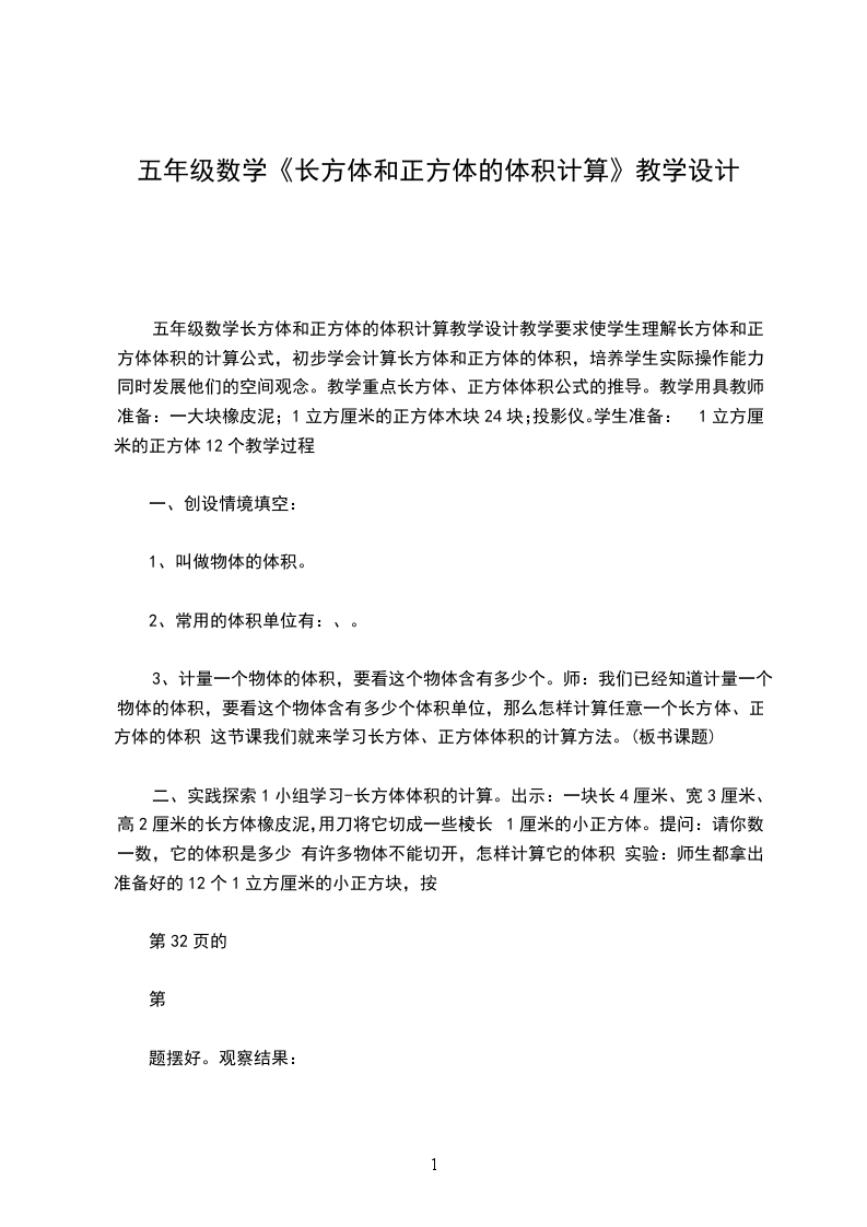 五年级数学长方体和正方体的体积计算教学设计教学要求使学生理解长方体和正方体体积的计算公式,初步学会计算长方体和正方体的体积,培养学生实际操作能力,同时发展他们的空间观念。教学重点长方体、正方体体积公式的推导。教学用具教师准备:一大块橡皮泥;1立方厘米的正方体木块24块;投影仪。学生准备:1立方厘米的正方体12个教学过程