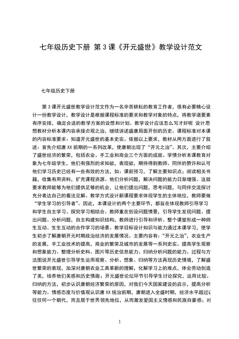 第3课开元盛世教学设计范文作为一名辛苦耕耘的教育工作者,很有必要精心设计一份教学设计,教学设计是根据课程标准的要求和教学对象的特点,将教学诸要素有序安排,确定合适的教学方案的设想和计划。教学设计应该怎么写才好呢 设计思想教材分析本课内容承接贞观之治,继续讲述盛唐局面开创的历史。课程标准对本课的内容标准要求:知道开元盛世的基本史实。依据以上要求,教材从两方面进行了叙述:首先介绍唐XX前期的一系列改革,使唐朝出现了“开元之治”。其次,主要介绍了盛世经济的繁荣,包括农业、手工业和商业三个方面的成就。学情分析本课教育对象为七年级学生,他们有强烈的求知欲,表现欲,期待得到教师、同伴的赞许和认可。他们学习历史已经有一些有效的方法,如:课前预习,了解主要知识点;阅读相关书籍,收集有用资料,扩充课程资源。他们分析问题,解决问题的能力日渐增强。这就要求教师能够为他们提供足够的机会,让他们提出问题,思考问题,与同伴交流探讨,充分表达自己的看法见解。教学方式设计新课程要求体现学生的主体地位,教师要做“学生学习的引导者”。因此,本课设计的两个主要环节,都旨在体现教师引导学习和学生自主学习、探究学习相结合。教师重在创设问题情景,引导学生发现问题、提出问题、分析问题,自主构建知识结构,教师进行引导和评析。整个课堂形成一种师生互动、生生互动的合作学习的场景。教学目标设计知识与能力通过本课学习,使学生初步了解唐朝开元时期政治经济的发展情况。主要内容有:“开元之治”,农业生产的发展,手工业技术的提高,商业的繁荣及城市的发展等一系列史实。提高学生观察和想象能力、整理分析史料、图片等历史信息能力、归纳分析问题的能力。过程与方法图说开元盛世引导学生运用观察、分析、想象、归纳等方法再现历史情境,了解盛世繁荣的表现,加深对唐朝农业工具革新的理解,化解学习上的难点,体会劳动创造了美,培养他们美感和历史情趣;开元盛世论坛环节引导学生讨论探究,运用比较、归纳的方法,初步认识唐朝经济繁荣的原因,对我们今天国家建设的启示,提高分析等能力。情感态度与价值观认识唐XX统治前期,唐朝进入全盛时期,经济水平超过以往任何一个朝代,而且居于世界领先地位,从而激发爱国主义情感和民族自豪感;对一些丝织品、陶瓷工艺品、城市布局的赏析和认知,激发学生对我国古代工匠精湛技艺的敬佩之情,提高鉴赏能力和审美情趣。教学重点盛世经济的繁荣。突破方法是通过图说开元盛世环节,让学生在重现历史情境的过程中,加深对这一部分知识的感知和认识。教学难点
