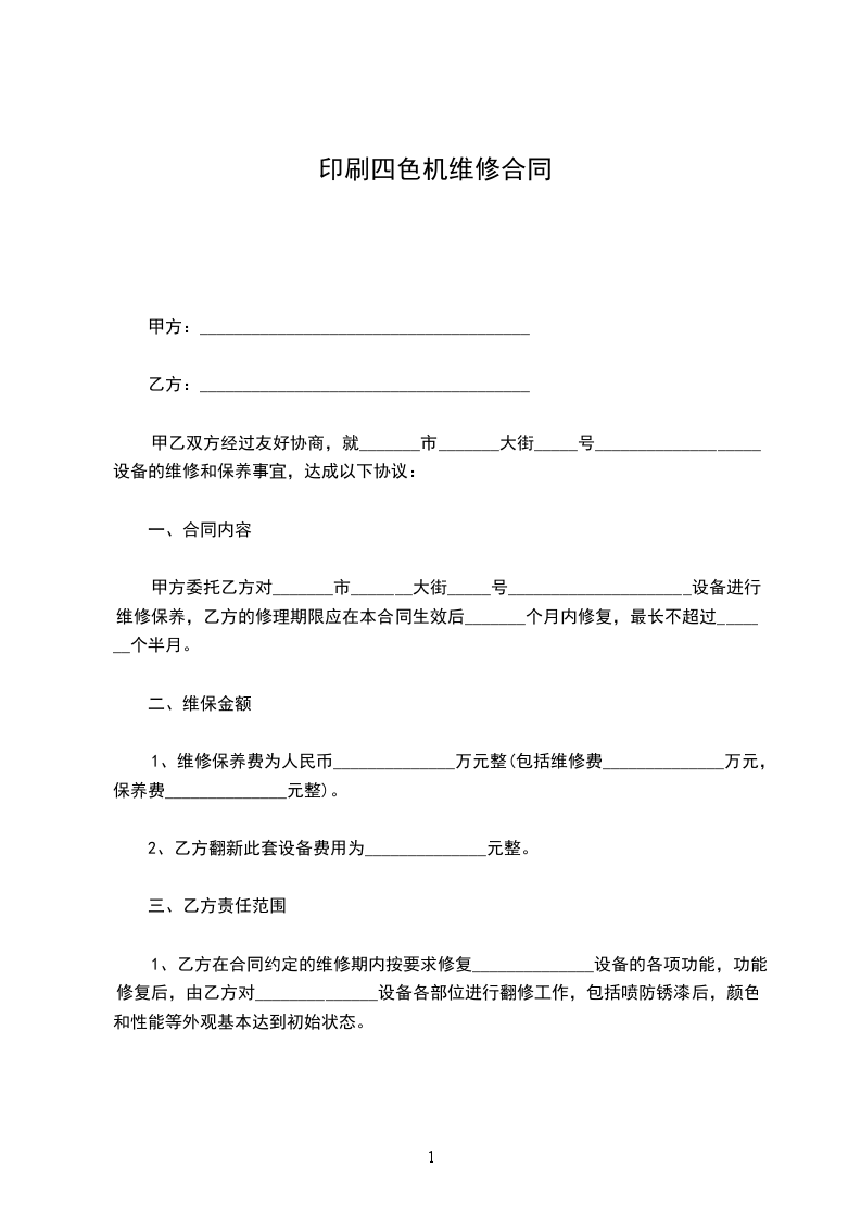 甲方委托乙方对_______市_______大街_____号_____________________设备进行维修保养,乙方的修理期限应在本合同生效后_______个月内修复,最长不超过_______个半月。