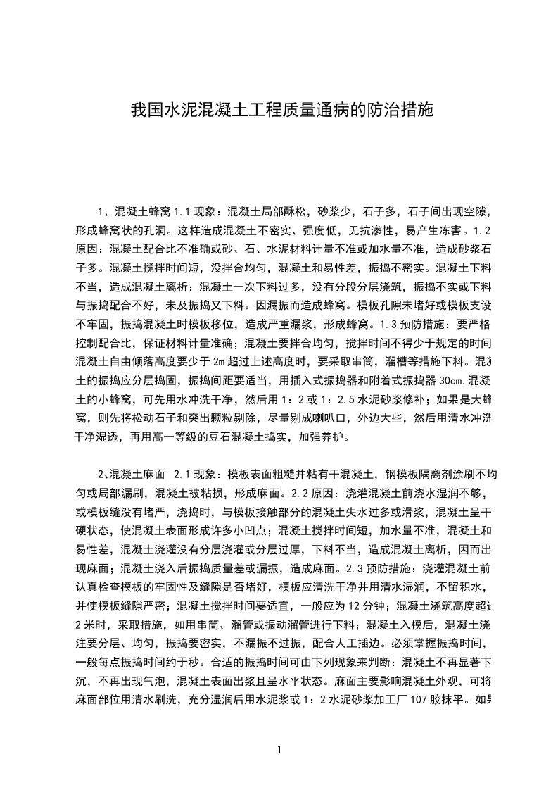 1、混凝土蜂窝1.1现象:混凝土局部酥松,砂浆少,石子多,石子间出现空隙,形成蜂窝状的孔洞。这样造成混凝土不密实、强度低,无抗渗性,易产生冻害。1.2原因:混凝土配合比不准确或砂、石、水泥材料计量不准或加水量不准,造成砂浆石子多。混凝土搅拌时间短,没拌合均匀,混凝土和易性差,振捣不密实。混凝土下料不当,造成混凝土离析:混凝土一次下料过多,没有分段分层浇筑,振捣不实或下料与振捣配合不好,未及振捣又下料。因漏振而造成蜂窝。模板孔隙未堵好或模板支设不牢固,振捣混凝土时模板移位,造成严重漏浆,形成蜂窝。1.3预防措施:要严格控制配合比,保证材料计量准确;混凝土要拌合均匀,搅拌时间不得少于规定的时间;混凝土自由倾落高度要少于2m超过上述高度时,要采取串筒,溜槽等措施下料。混凝土的振捣应分层捣固,振捣间距要适当,用插入式振捣器和附着式振捣器30cm.混凝土的小蜂窝,可先用水冲洗干净,然后用1:2或1:2.5水泥砂浆修补;如果是大蜂窝,则先将松动石子和突出颗粒剔除,尽量剔成喇叭口,外边大些,然后用清水冲洗干净湿透,再用高一等级的豆石混凝土捣实,加强养护。