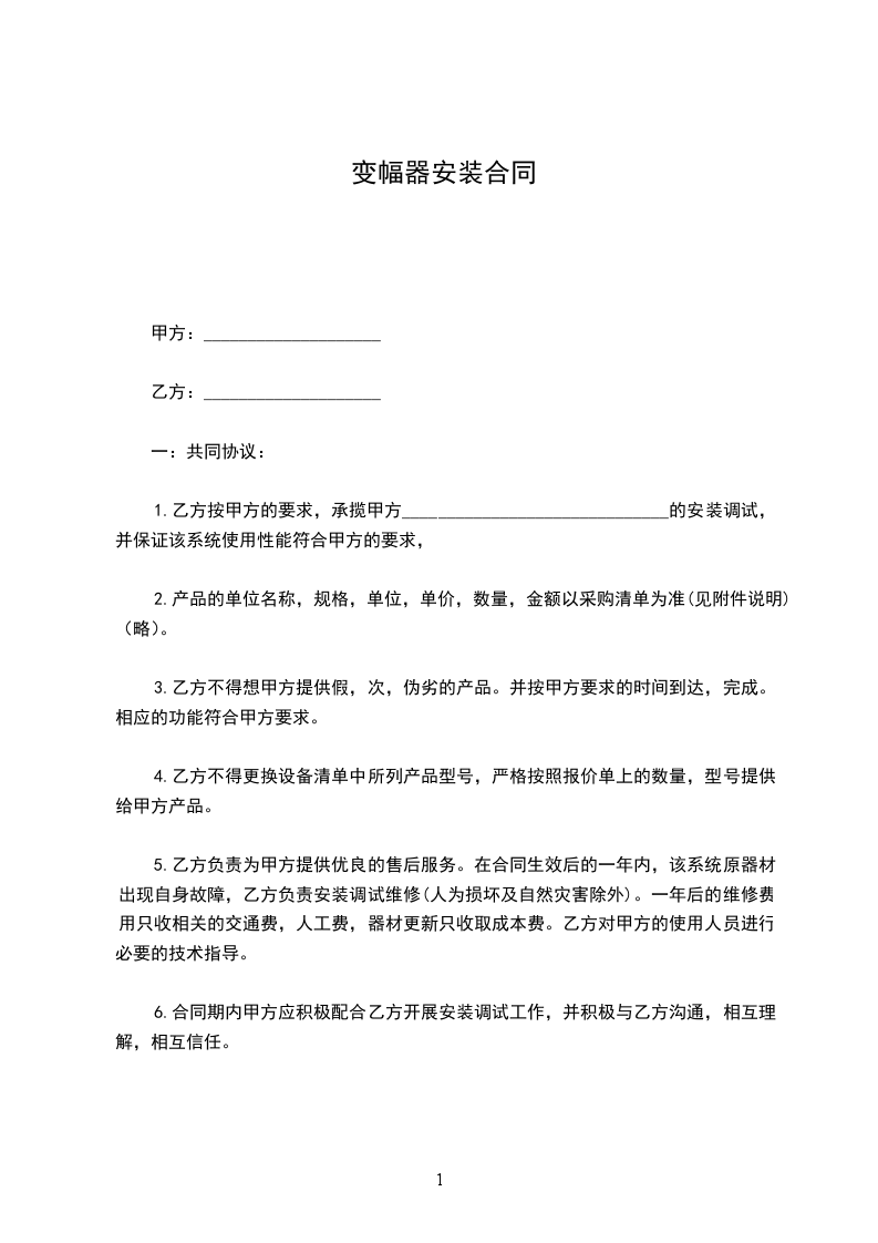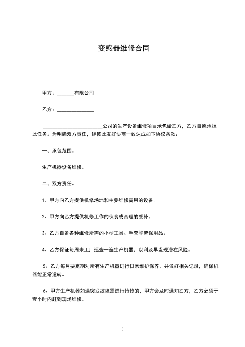 本协议由甲、乙双方共同协商一致制定的。自本协议生效之日起一年内,乙方为甲方维修保养_____________________。乙方严格按技术标准进行工作,确保系统高效、正常运行。