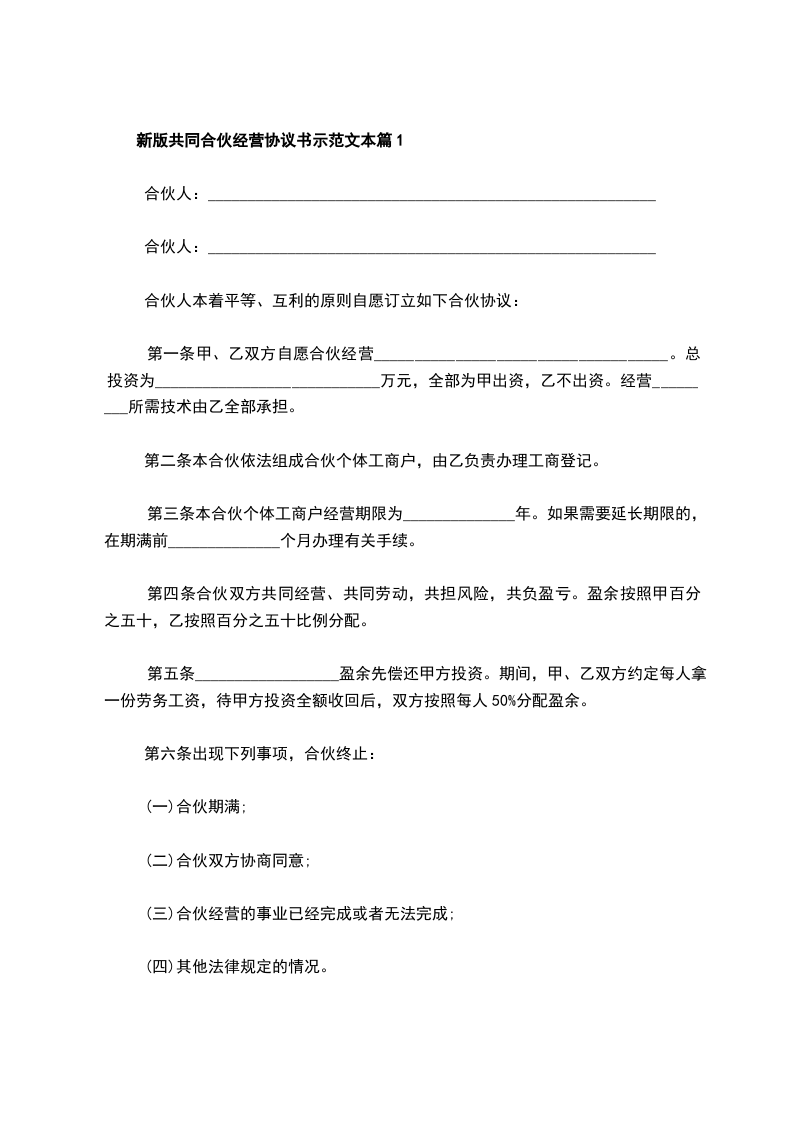 3、各合伙人出资共计人民币________元。合伙期间各合伙人的出资为共有财产,不得随意请求分割。合伙人退伙时,可在结算后退还退货人的财产份额。合伙企业解散清算后,各合伙人可按规定参与分配。