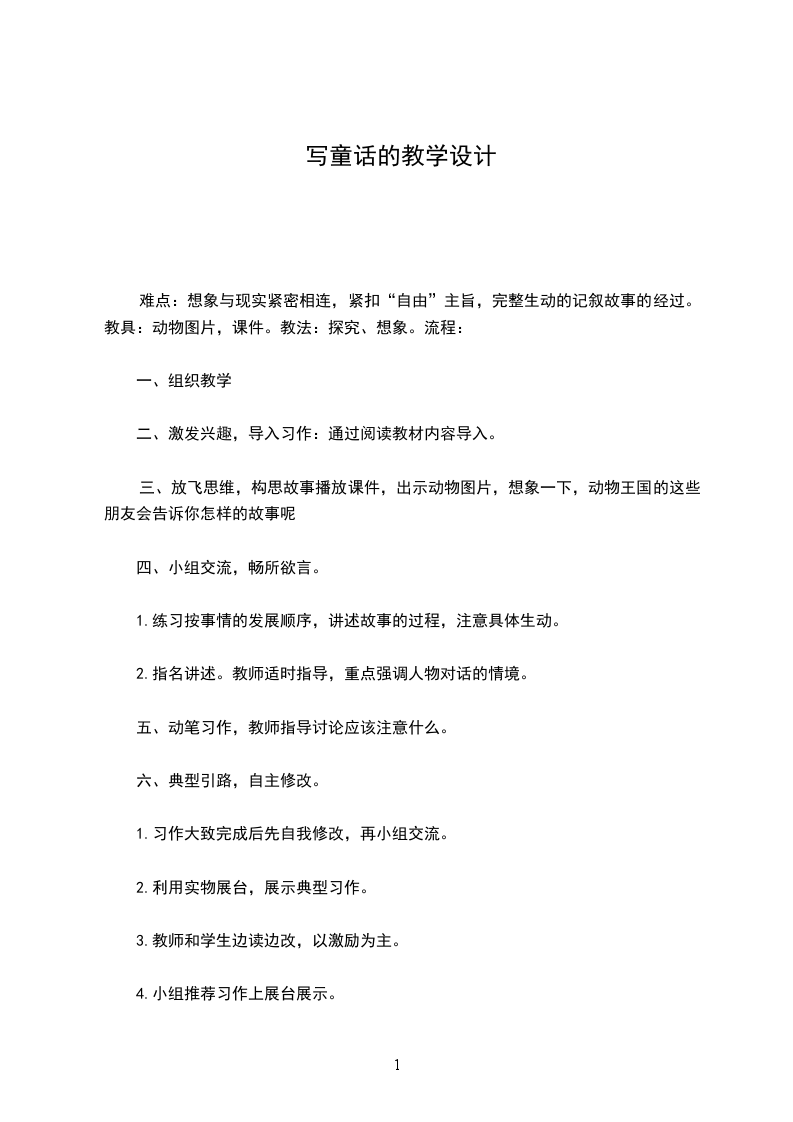 难点:想象与现实紧密相连,紧扣“自由”主旨,完整生动的记叙故事的经过。教具:动物图片,课件。教法:探究、想象。流程: