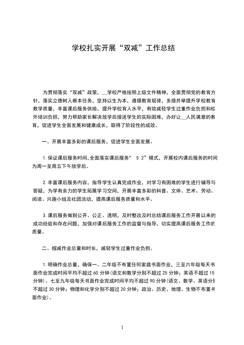 为贯彻落实“双减”政策,__学校严格按照上级文件精神,全面贯彻党的教育方针,落实立德树人根本任务,坚持以生为本,遵循教育规律,多措并举提升学校教育教学质量,丰富课后服务供给,提升学校育人水平,有效减轻学生过重作业负担和校外培训负担,努力帮助家长解决放学后接送学生的实际困难,办好让__人民满意的教育,促进学生全面发展和健康成长,取得了阶段性的成效。