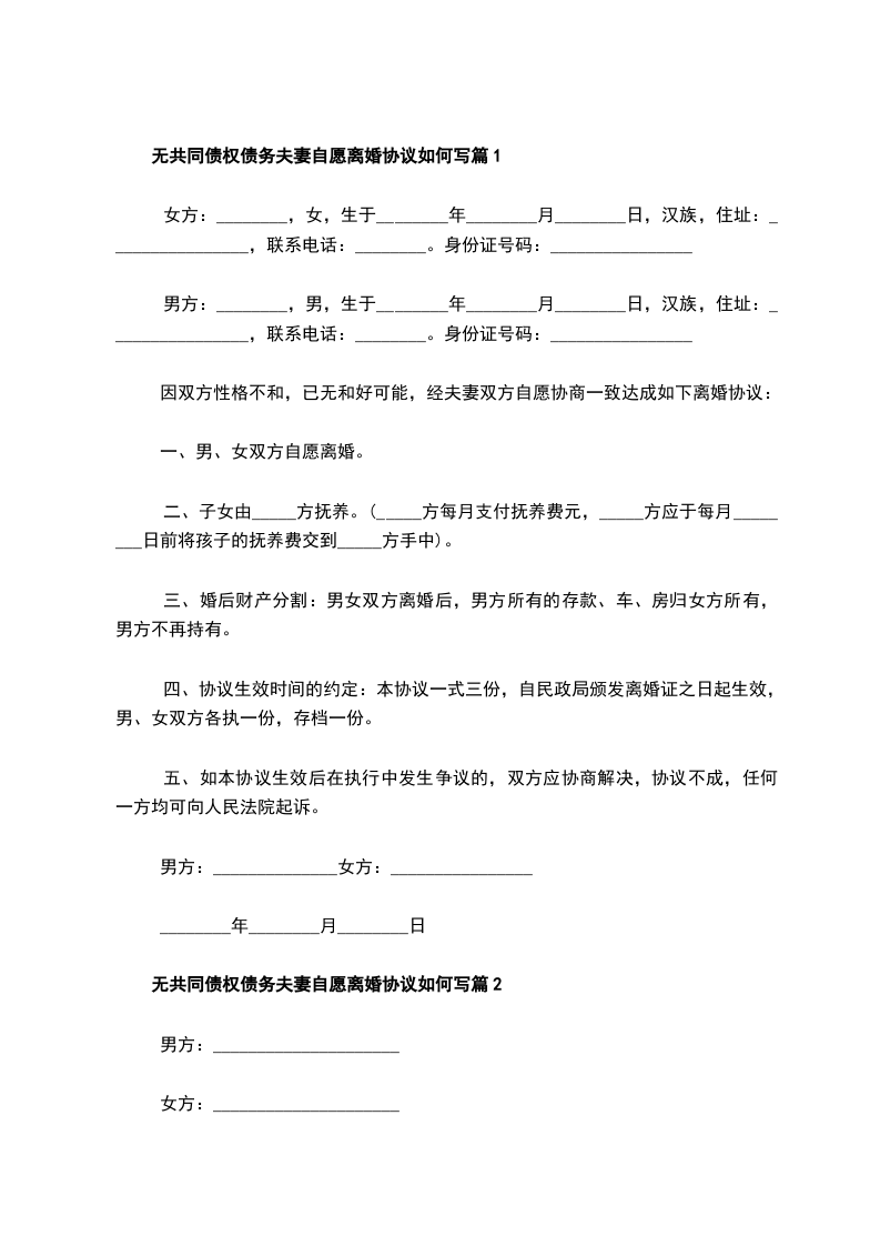 无共同债权债务夫妻自愿离婚协议如何写篇2