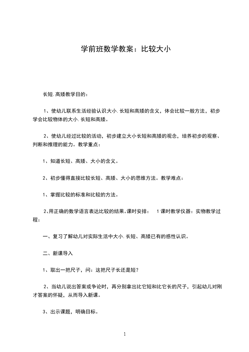 一、复习了解幼儿对实际生活中大小.长短、高矮已有的感性认识。