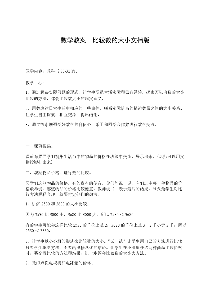 2、用正确的数学语言表达比较的结果。课时安排:1课时教学仪器:实物教学过程: