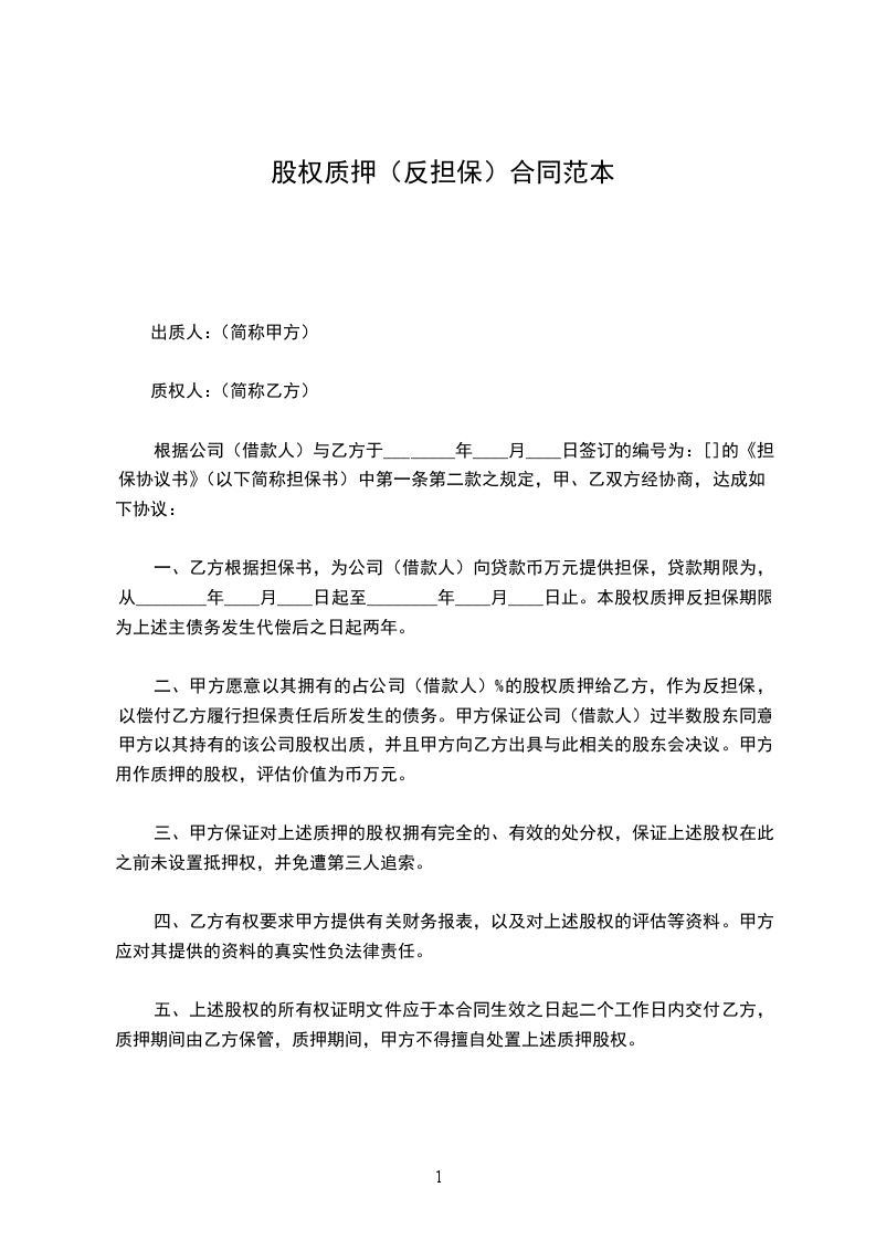 二、甲方愿意以其拥有的占公司(借款人)%的股权质押给乙方,作为反担保,以偿付乙方履行担保责任后所发生的债务。甲方保证公司(借款人)过半数股东同意甲方以其持有的该公司股权出质,并且甲方向乙方出具与此相关的股东会决议。甲方用作质押的股权,评估价值为币万元。