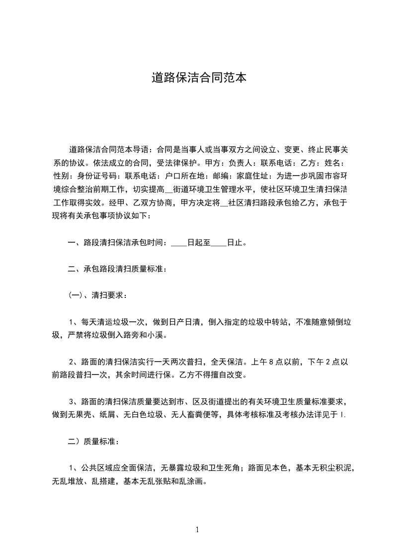 道路保洁合同范本导语:合同是当事人或当事双方之间设立、变更、终止民事关系的协议。依法成立的合同,受法律保护。甲方:负责人:联系电话:乙方:姓名:性别:身份证号码:联系电话:户口所在地:邮编:家庭住址:为进一步巩固市容环境综合整治前期工作,切实提高__街道环境卫生管理水平,使社区环境卫生清扫保洁工作取得实效。经甲、乙双方协商,甲方决定将__社区清扫路段承包给乙方,承包于。现将有关承包事项协议如下: