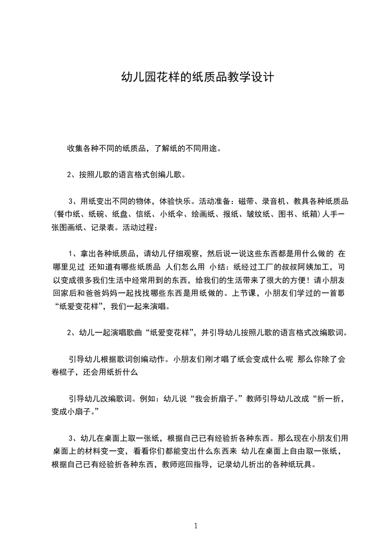 1、拿出各种纸质品,请幼儿仔细观察,然后说一说这些东西都是用什么做的 在哪里见过 还知道有哪些纸质品 人们怎么用 小结:纸经过工厂的叔叔阿姨加工,可以变成很多我们生活中经常用到的东西,给我们的生活带来了很大的方便!请小朋友回家后和爸爸妈妈一起找找哪些东西是用纸做的。上节课,小朋友们学过的一首歌“纸爱变花样”,我们一起来演唱。