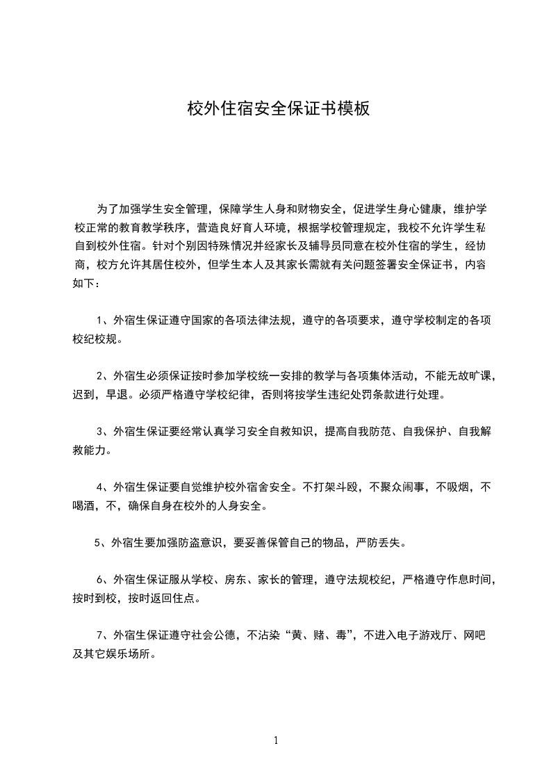 为了加强学生安全管理,保障学生人身和财物安全,促进学生身心健康,维护学校正常的教育教学秩序,营造良好育人环境,根据学校管理规定,我校不允许学生私自到校外住宿。针对个别因特殊情况并经家长及辅导员同意在校外住宿的学生,经协商,校方允许其居住校外,但学生本人及其家长需就有关问题签署安全保证书,内容如下: