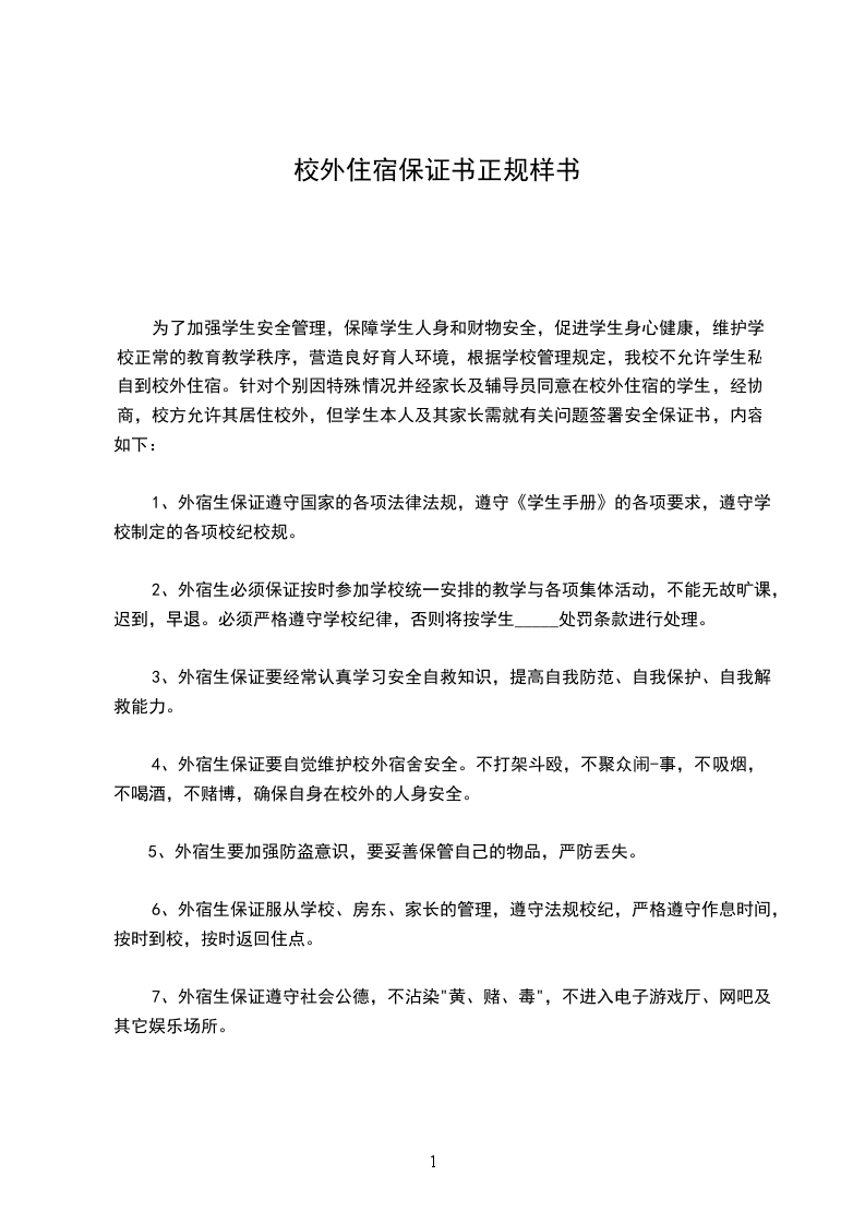 6、外宿生保证服从学校、房东、家长的管理,遵守法规校纪,严格遵守作息时间,按时到校,按时返回住点。
