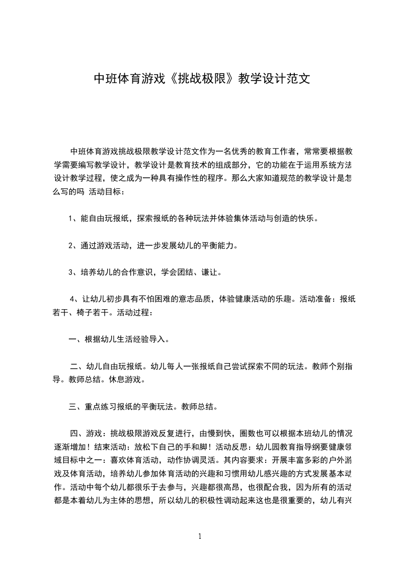 中班体育游戏挑战极限教学设计范文作为一名优秀的教育工作者,常常要根据教学需要编写教学设计,教学设计是教育技术的组成部分,它的功能在于运用系统方法设计教学过程,使之成为一种具有操作性的程序。那么大家知道规范的教学设计是怎么写的吗 活动目标: