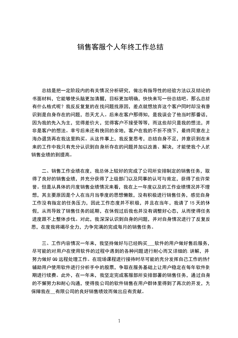 五、公司管理建议为了更好做好未来的销售任务以及其他各项工作,实际提升公司的团里销售热情,提高公司的销售业绩。我结合自身的任务都不一样,补齐不完善遗漏的制度,保证落实制度,而不只是口说而已。并加以公示摆明,时效执行,如果奖励制度是让人激励的,而不是消极的,则将会更好的促进我公司客服人员的销售热情,并将会提升客服人员对工作的认真负责,实际提升我公司的销售绩效。3即将过去,在这将近一年的时间中我通过努力的工作,也有了一点收获,临近年终,我感觉有必要对自己的工作做一下总结。目的在于吸取教训,提高自己,以至于把工作做的更好,自己有信心也有决心把明年的工作做的更好。下面我对一年的工作进行简要的总结。我是今年十月份到公司工作的,同时开始组建销售部,进入公司之后我通过不断的学习产品知识,收取同行业之间的信息和积累市场经验,现在对预付费储值卡市场有了一个深入的认识和了解。可以清晰、流利的应对客户所提到的各种问题,准确的把握客户的需要,良好的与客户沟通,逐渐取得客户的信任。所以经过努力,也取得了几个成功的客户资源,一些优质客户也逐渐积累到了一定程度,对市场的认识也有一个比较透明的掌握。在不断的学习产品知识和积累经验的同时,自己的能力,业务水平都比以前有了一个较大幅度的提高。虽然之前一直在从事销售的相关工作,有一定的销售知识与经验,但比较优秀的成功的销售管理人才,还是有一定距离的。本职的工作做得不好,感觉自己还停留在一个销售人员的位置上,对销售人员的培训,指导力度不够,影响销售部的销售业绩。一.部门工作总结在将近三个月的时间中,经过销售部全体员工共同的努力,讨论制定销售各环节话术,公司产品的核心竞争优势,公司宣传资料至客户的一封信,为各媒体广告出谋划策,提出“万事德行天下”的核心语句,使我们公司的产品知名度在太原市场上渐渐被客户所认识。部门全体员工累计整理黄页资料五千余条,寄出公司宣传资料三千余封,不畏严寒,在税务大厅,高新区各个写字楼进行陌生拜访,为即将到来的疯狂销售旺季打好了基础做好了准备。团队建设方面,制定了详细的销售人员考核标准,与销售部运行制度,工作流程,团队文化等。这是我认为我们做的比较好的方面,但在其他方面在工作中我们做法还是存在很大的问题。从销售部门销售业绩上看,我们的工作做的是不好的,可以说是销售做的十分的失败。客观上的一些因素虽然存在,在工作中其他的一些做法也有很大的问题,主要表现在2)沟通不够深入。销售人员在与客户沟通的过程中,不能把我们公司产品的情况十分清晰的传达给客户,了解客户的真正想法和意图;对客户提出的某项建议不能做出迅速的反应。在传达产品信息时不知道客户对我们的产品有几分了解或接受的什么程度,在被拒绝之后没有二次追踪是一个致命的失误。3)工作没有一个明确的目标和详细的计划。销售人员没有养成一个写工作总结和计划的习惯,销售工作处于放任自流的状态,从而引发销售工作没有一个统一的管理,工作时间没有合理的分配,工作局面混乱等各种不良的后果。4)新业务的开拓不够,业务增长小,个别业务员的工作责任心和工作计划性不强,业务能力还有待提高。二.市场分析现在太原消费卡市场品牌很多,但主要也就是那几家公司,现在我们公司的产品从产品质量,功能上属于上等的产品。表面上各家公司之间竞争是激烈的,我公司的出现更是加剧了这一场竞争战。但冷静下来仔细分析,我公司的核心竞争力,例如发卡资金的监管,山西省境外商户的数量与质量,以及我公司雄厚的资金实力与优质的客户资源,都是其他公司无法比拟的。在太原市场上,消费卡产品品牌众多,但以我公司雄厚的实力为平台,加以铺天盖地的宣传态势,以及员工锲而不舍的工作劲头,在明年的消费卡市场取得大比例的市场占有率已成定局,打造山西省业内的第一品牌指日可待。市场是良好的,形势是严峻的。在太原消费卡市场可以用这一句话来概括,在技术发展飞快地今天,明年是大有作为的一年,假如在明年一年内没有把销售做好,没有抓住这个机遇,我们很可能失去这个蓬勃发展的机会。